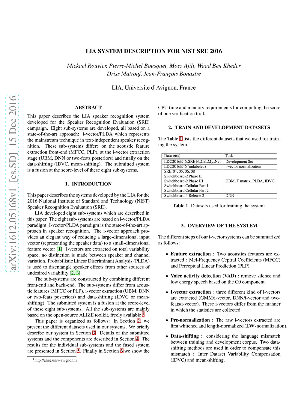 This paper describes the LIA speaker recognition system developed for the Speaker Recognition Evaluation (SRE) campaign. Eight sub-systems are developed, all based on a state-of-the-art approach: i-vector/PLDA which represents the mainstream technique in text-independent speaker recognition. These sub-systems differ: on the acoustic feature extraction front-end (MFCC, PLP), at the i-vector extraction stage (UBM, DNN or two-feats posteriors) and finally on the data-shifting (IDVC, mean-shifting). The submitted system is a fusion at the score-level of these eight sub-systems.