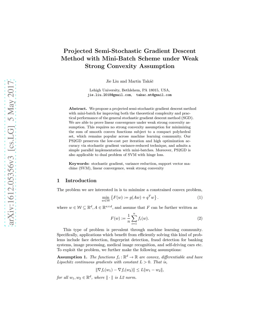 We propose a projected semi-stochastic gradient descent method with mini-batch for improving both the theoretical complexity and practical performance of the general stochastic gradient descent method (SGD). We are able to prove linear convergence under weak strong convexity assumption. This requires no strong convexity assumption for minimizing the sum of smooth convex functions subject to a compact polyhedral set, which remains popular across machine learning community. Our PS2GD preserves the low-cost per iteration and high optimization accuracy via stochastic gradient variance-reduced technique, and admits a simple parallel implementation with mini-batches. Moreover, PS2GD is also applicable to dual problem of SVM with hinge loss.