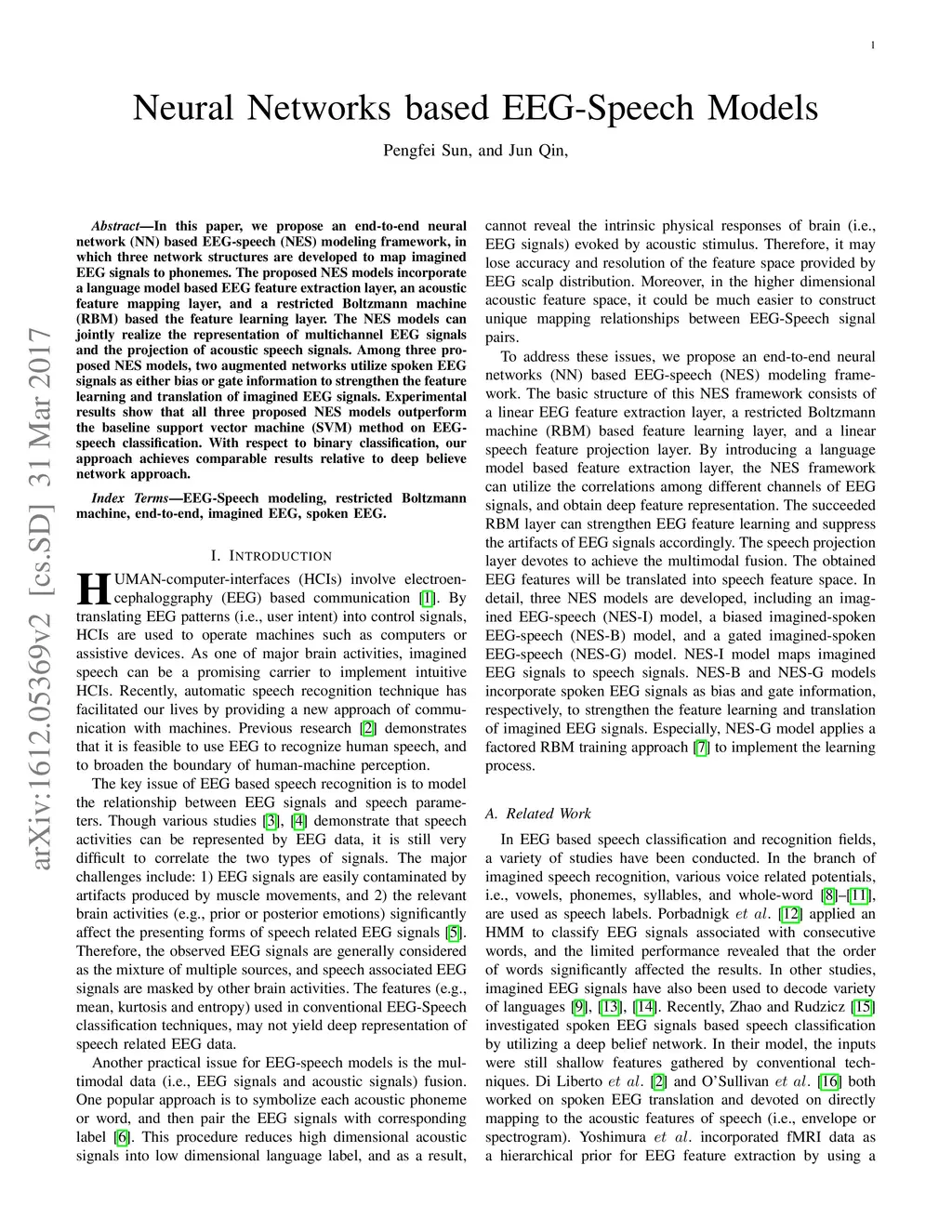In this paper, we propose an end-to-end neural network (NN) based EEG-speech (NES) modeling framework, in which three network structures are developed to map imagined EEG signals to phonemes. The proposed NES models incorporate a language model based EEG feature extraction layer, an acoustic feature mapping layer, and a restricted Boltzmann machine (RBM) based the feature learning layer. The NES models can jointly realize the representation of multichannel EEG signals and the projection of acoustic speech signals. Among three proposed NES models, two augmented networks utilize spoken EEG signals as either bias or gate information to strengthen the feature learning and translation of imagined EEG signals. Experimental results show that all three proposed NES models outperform the baseline support vector machine (SVM) method on EEG-speech classification. With respect to binary classification, our approach achieves comparable results relative to deep believe network approach.
