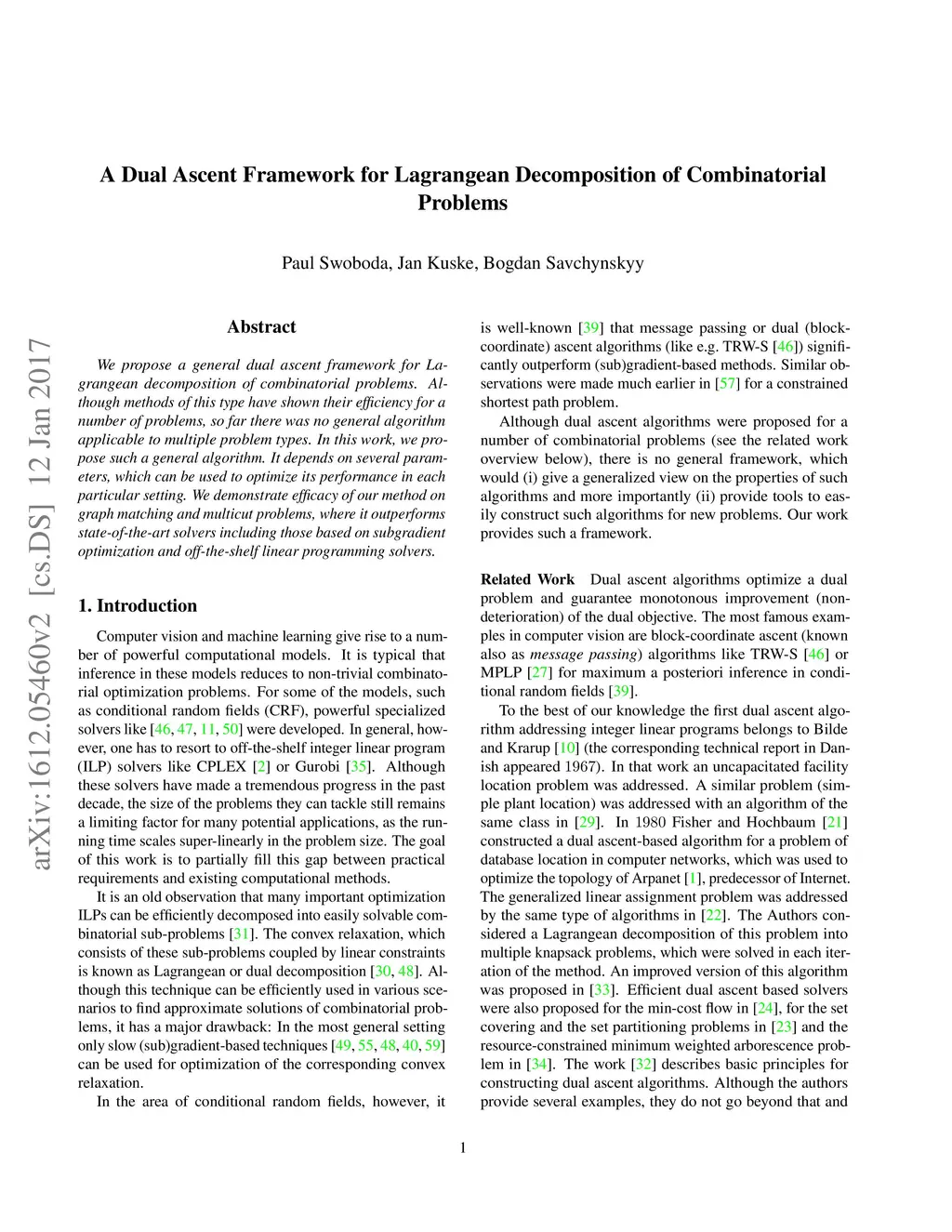 We propose a general dual ascent framework for Lagrangean decomposition of combinatorial problems. Although methods of this type have shown their efficiency for a number of problems, so far there was no general algorithm applicable to multiple problem types. In his work, we propose such a general algorithm. It depends on several parameters, which can be used to optimize its performance in each particular setting. We demonstrate efficacy of our method on graph matching and multicut problems, where it outperforms state-of-the-art solvers including those based on subgradient optimization and off-the-shelf linear programming solvers.