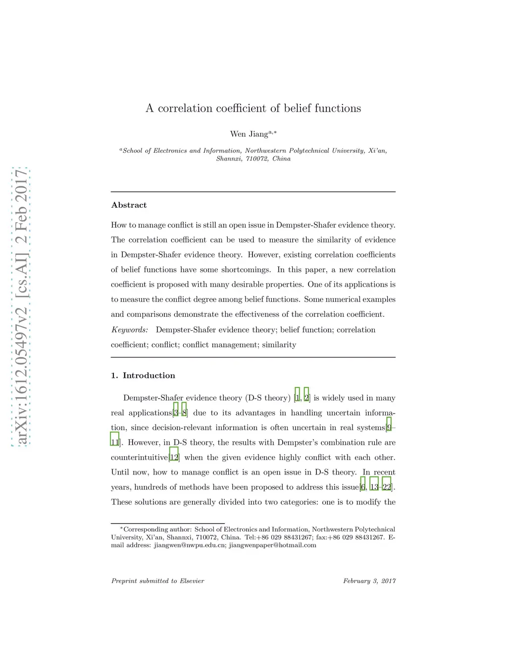 How to manage conflict is still an open issue in Dempster-Shafer evidence theory. The correlation coefficient can be used to measure the similarity of evidence in Dempster-Shafer evidence theory. However, existing correlation coefficients of belief functions have some shortcomings. In this paper, a new correlation coefficient is proposed with many desirable properties. One of its applications is to measure the conflict degree among belief functions. Some numerical examples and comparisons demonstrate the effectiveness of the correlation coefficient.
