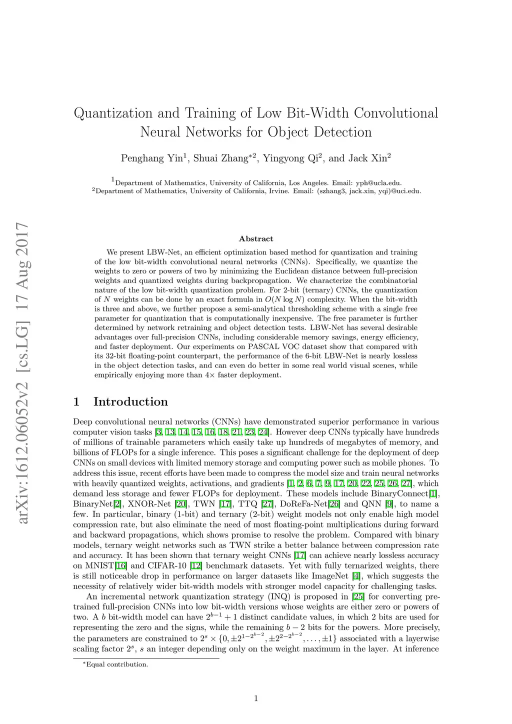 We present LBW-Net, an efficient optimization based method for quantization and training of the low bit-width convolutional neural networks (CNNs). Specifically, we quantize the weights to zero or powers of two by minimizing the Euclidean distance between full-precision weights and quantized weights during backpropagation. We characterize the combinatorial nature of the low bit-width quantization problem. For 2-bit (ternary) CNNs, the quantization of weights can be done by an exact formula in complexity. When the bit-width is three and above, we further propose a semi-analytical thresholding scheme with a single free parameter for quantization that is computationally inexpensive. The free parameter is further determined by network retraining and object detection tests. LBW-Net has several desirable advantages over full-precision CNNs, including considerable memory savings, energy efficiency, and faster deployment. Our experiments on PASCAL VOC dataset show that compared with its 32-bit floating-point counterpart, the performance of the 6-bit LBW-Net is nearly lossless in the object detection tasks, and can even do better in some real world visual scenes, while empirically enjoying more than 4 faster deployment.