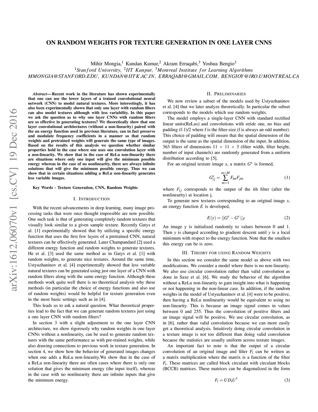 Recent work in the literature has shown experimentally that one can use the lower layers of a trained convolutional neural network (CNN) to model natural textures. More interestingly, it has also been experimentally shown that only one layer with random filters can also model textures although with less variability. In this paper we ask the question as to why one layer CNNs with random filters are so effective in generating textures? We theoretically show that one layer convolutional architectures (without a non-linearity) paired with the an energy function used in previous literature, can in fact preserve and modulate frequency coefficients in a manner so that random weights and pretrained weights will generate the same type of images. Based on the results of this analysis we question whether similar properties hold in the case where one uses one convolution layer with a non-linearity. We show that in the case of ReLu non-linearity there are situations where only one input will give the minimum possible energy whereas in the case of no nonlinearity, there are always infinite solutions that will give the minimum possible energy. Thus we can show that in certain situations adding a ReLu non-linearity generates less variable images.