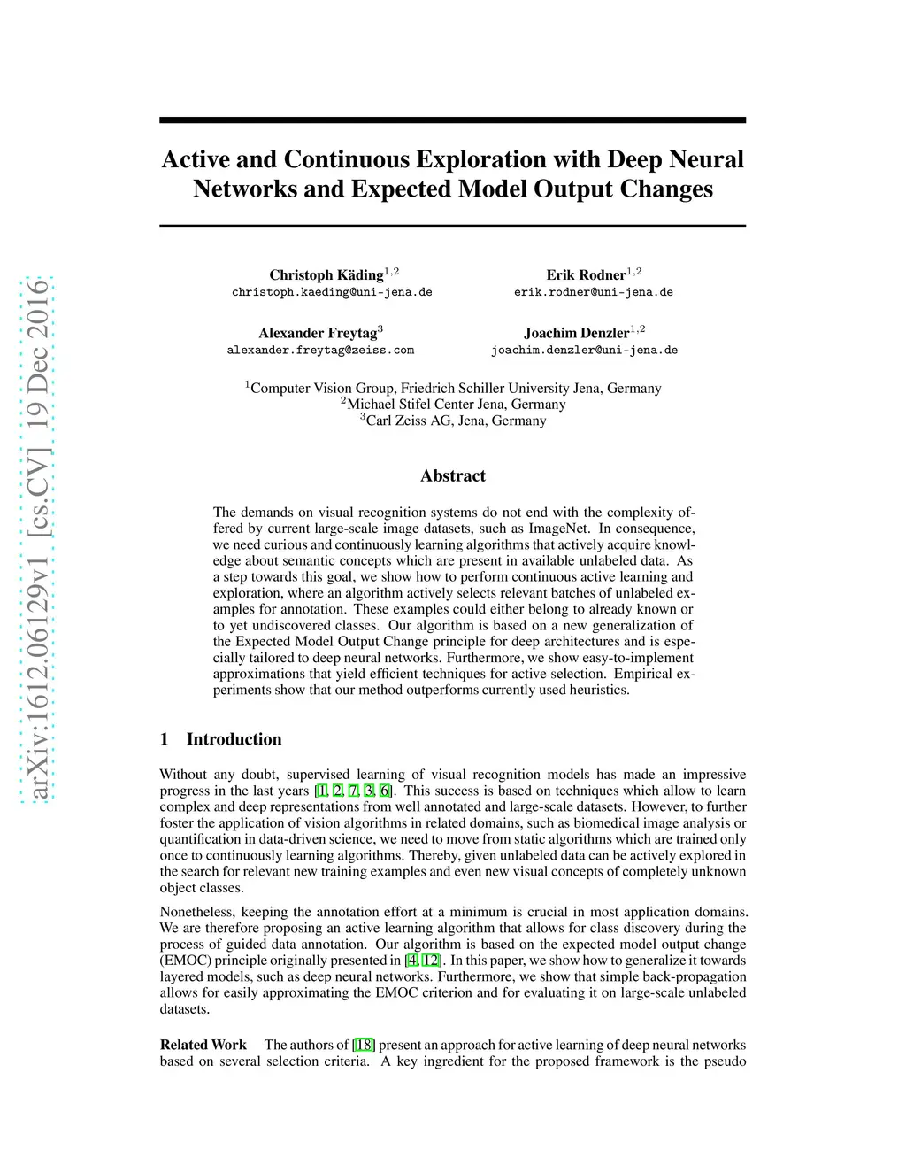 The demands on visual recognition systems do not end with the complexity offered by current large-scale image datasets, such as ImageNet. In consequence, we need curious and continuously learning algorithms that actively acquire knowledge about semantic concepts which are present in available unlabeled data. As a step towards this goal, we show how to perform continuous active learning and exploration, where an algorithm actively selects relevant batches of unlabeled examples for annotation. These examples could either belong to already known or to yet undiscovered classes. Our algorithm is based on a new generalization of the Expected Model Output Change principle for deep architectures and is especially tailored to deep neural networks. Furthermore, we show easy-to-implement approximations that yield efficient techniques for active selection. Empirical experiments show that our method outperforms currently used heuristics.