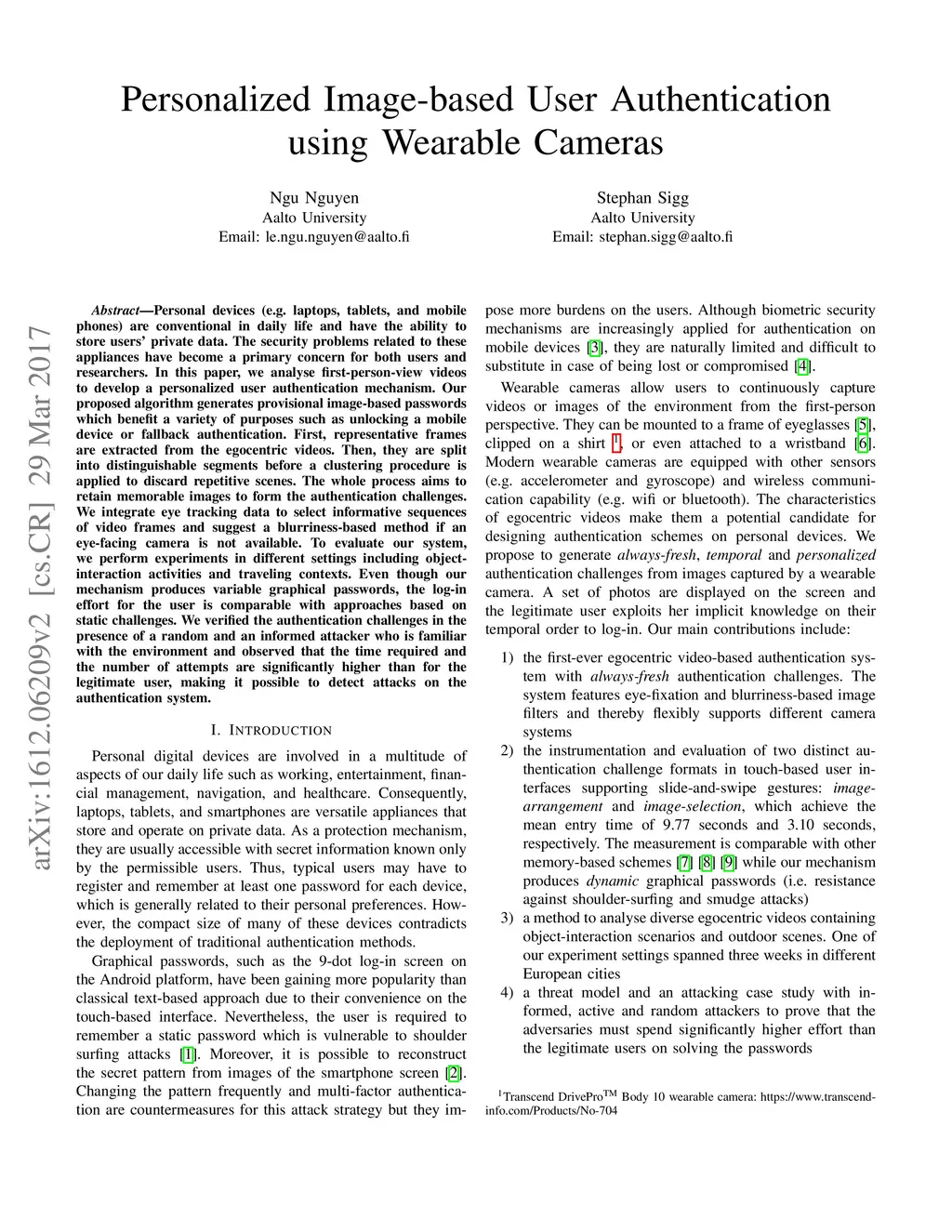 Personal devices (e.g. laptops, tablets, and mobile phones) are conventional in daily life and have the ability to store users' private data. The security problems related to these appliances have become a primary concern for both users and researchers. In this paper, we analyse first-person-view videos to develop a personalized user authentication mechanism. Our proposed algorithm generates provisional image-based passwords which benefit a variety of purposes such as unlocking a mobile device or fallback authentication. First, representative frames are extracted from the egocentric videos. Then, they are split into distinguishable segments before a clustering procedure is applied to discard repetitive scenes. The whole process aims to retain memorable images to form the authentication challenges. We integrate eye tracking data to select informative sequences of video frames and suggest a blurriness-based method if an eye-facing camera is not available. To evaluate our system, we perform experiments in different settings including object-interaction activities and traveling contexts. Even though our mechanism produces variable graphical passwords, the log-in effort for the user is comparable with approaches based on static challenges. We verified the authentication challenges in the presence of a random and an informed attacker who is familiar with the environment and observed that the time required and the number of attempts are significantly higher than for the legitimate user, making it possible to detect attacks on the authentication system.