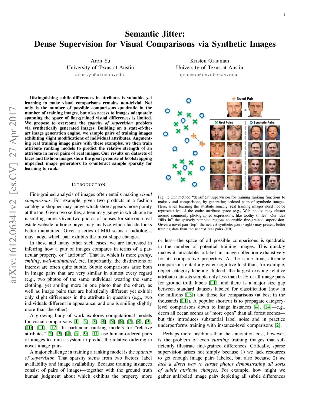 Distinguishing subtle differences in attributes is valuable, yet learning to make visual comparisons remains non-trivial. Not only is the number of possible comparisons quadratic in the number of training images, but also access to images adequately spanning the space of fine-grained visual differences is limited. We propose to overcome the sparsity of supervision problem via synthetically generated images. Building on a state-of-the-art image generation engine, we sample pairs of training images exhibiting slight modifications of individual attributes. Augmenting real training image pairs with these examples, we then train attribute ranking models to predict the relative strength of an attribute in novel pairs of real images. Our results on datasets of faces and fashion images show the great promise of bootstrapping imperfect image generators to counteract sample sparsity for learning to rank.