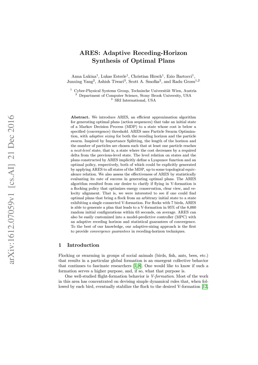 We introduce ARES, an efficient approximation algorithm for generating optimal plans (action sequences) that take an initial state of a Markov Decision Process (MDP) to a state whose cost is below a specified (convergence) threshold. ARES uses Particle Swarm Optimization, with adaptive sizing for both the receding horizon and the particle swarm. Inspired by Importance Splitting, the length of the horizon and the number of particles are chosen such that at least one particle reaches a next-level state, that is, a state where the cost decreases by a required delta from the previous-level state. The level relation on states and the plans constructed by ARES implicitly define a Lyapunov function and an optimal policy, respectively, both of which could be explicitly generated by applying ARES to all states of the MDP, up to some topological equivalence relation. We also assess the effectiveness of ARES by statistically evaluating its rate of success in generating optimal plans. The ARES algorithm resulted from our desire to clarify if flying in V-formation is a flocking policy that optimizes energy conservation, clear view, and velocity alignment. That is, we were interested to see if one could find optimal plans that bring a flock from an arbitrary initial state to a state exhibiting a single connected V-formation. For flocks with 7 birds, ARES is able to generate a plan that leads to a V-formation in 95% of the 8,000 random initial configurations within 63 seconds, on average. ARES can also be easily customized into a model-predictive controller (MPC) with an adaptive receding horizon and statistical guarantees of convergence. To the best of our knowledge, our adaptive-sizing approach is the first to provide convergence guarantees in receding-horizon techniques.