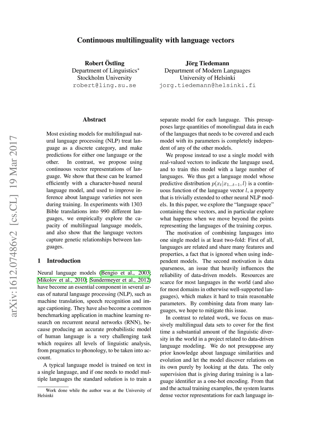 Continuous multilinguality with language vectors