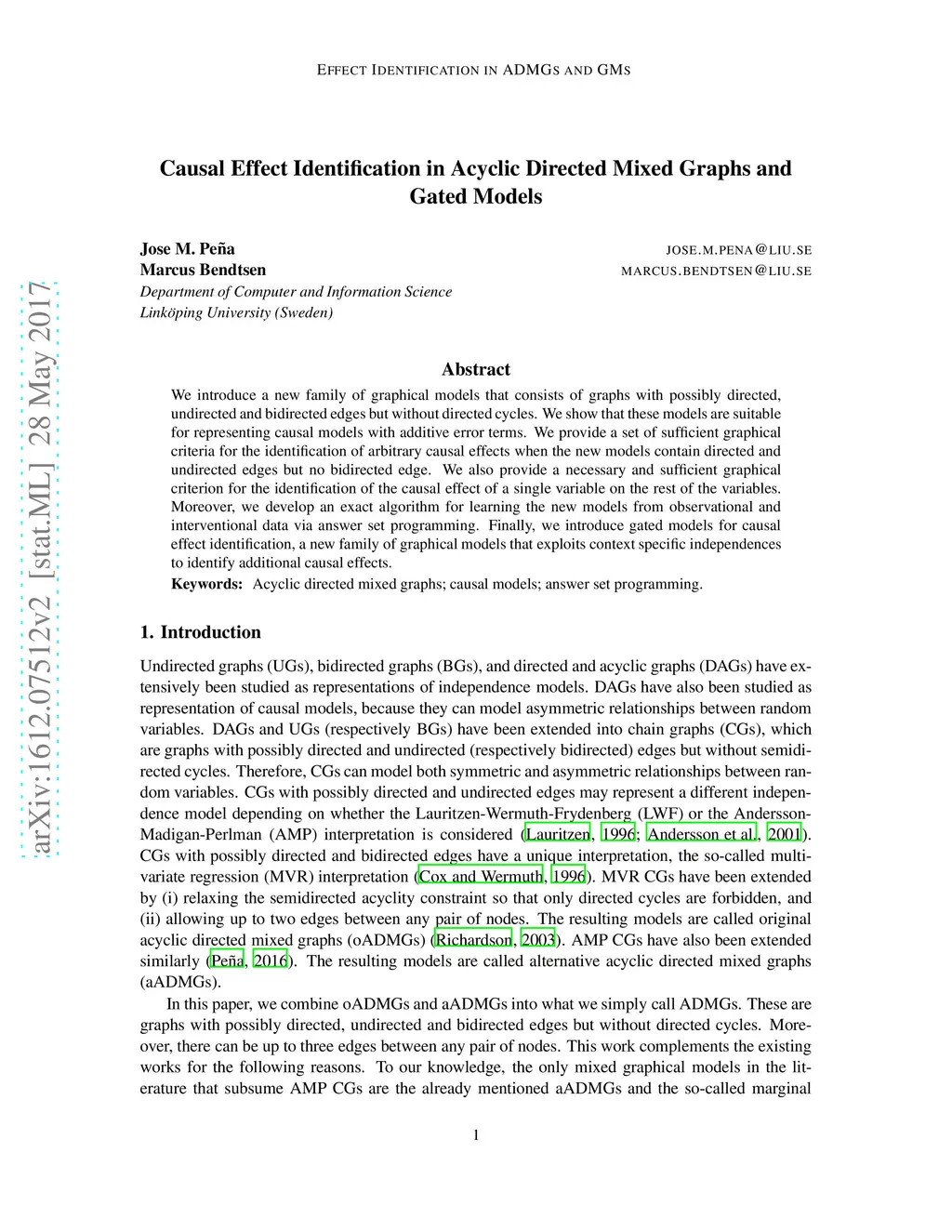 We introduce a new family of graphical models that consists of graphs with possibly directed, undirected and bidirected edges but without directed cycles. We show that these models are suitable for representing causal models with additive error terms. We provide a set of sufficient graphical criteria for the identification of arbitrary causal effects when the new models contain directed and undirected edges but no bidirected edge. We also provide a necessary and sufficient graphical criterion for the identification of the causal effect of a single variable on the rest of the variables. Moreover, we develop an exact algorithm for learning the new models from observational and interventional data via answer set programming. Finally, we introduce gated models for causal effect identification, a new family of graphical models that exploits context specific independences to identify additional causal effects.
