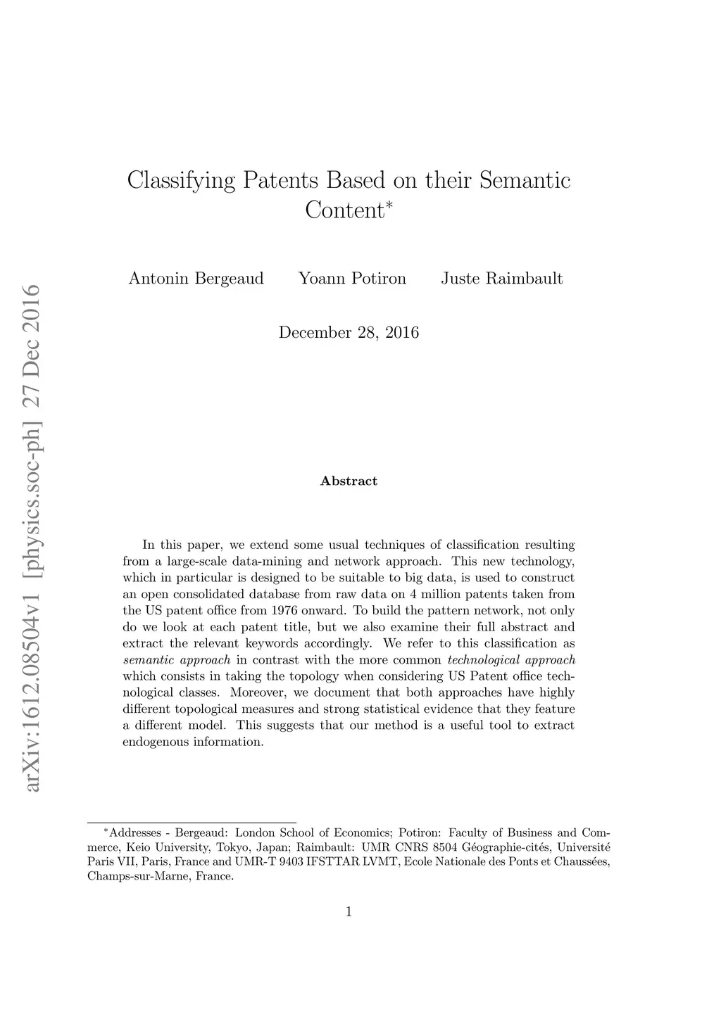 In this paper, we extend some usual techniques of classification resulting from a large-scale data-mining and network approach. This new technology, which in particular is designed to be suitable to big data, is used to construct an open consolidated database from raw data on 4 million patents taken from the US patent office from 1976 onward. To build the pattern network, not only do we look at each patent title, but we also examine their full abstract and extract the relevant keywords accordingly. We refer to this classification as semantic approach in contrast with the more common technological approach which consists in taking the topology when considering US Patent office technological classes. Moreover, we document that both approaches have highly different topological measures and strong statistical evidence that they feature a different model. This suggests that our method is a useful tool to extract endogenous information.