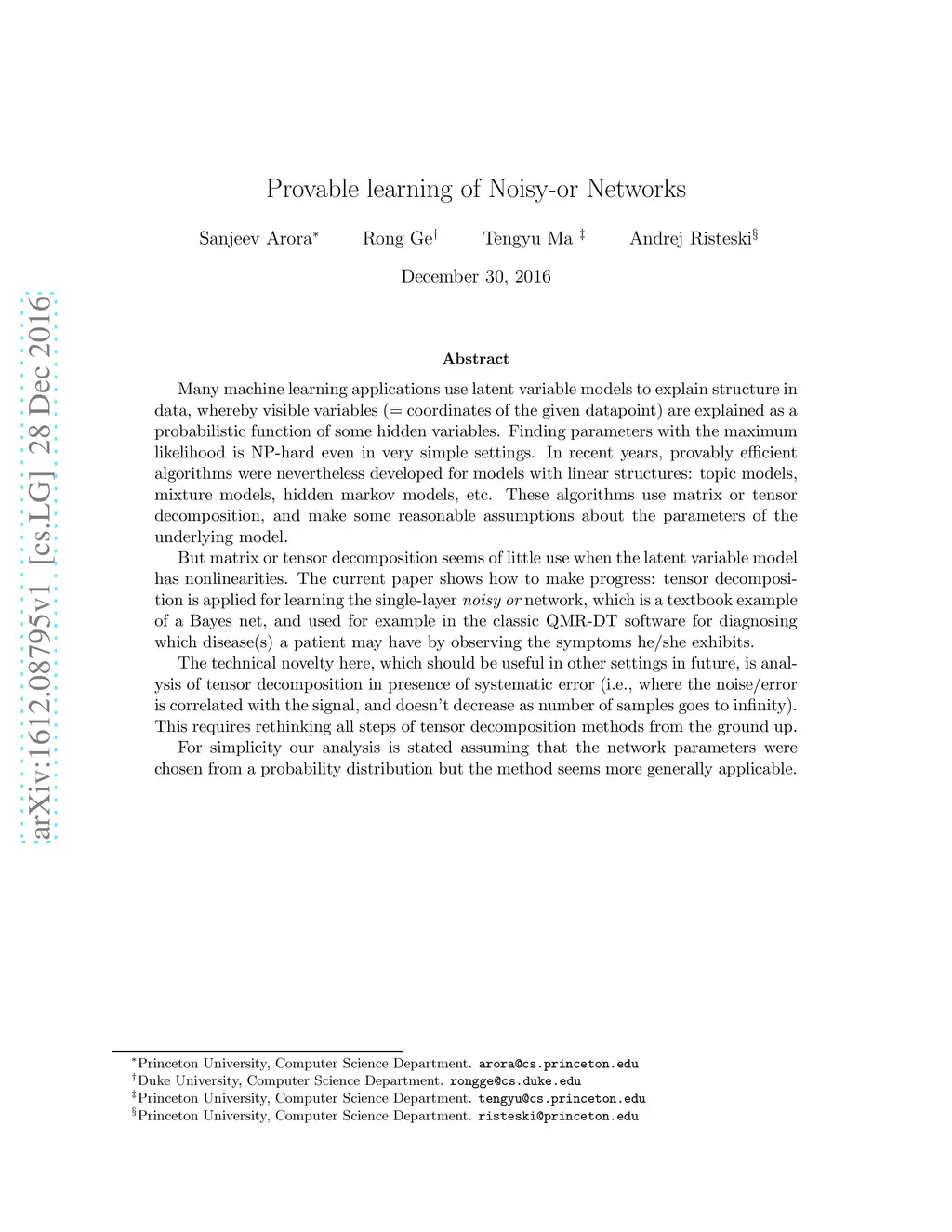 Many machine learning applications use latent variable models to explain structure in data, whereby visible variables (= coordinates of the given datapoint) are explained as a probabilistic function of some hidden variables. Finding parameters with the maximum likelihood is NP-hard even in very simple settings. In recent years, provably efficient algorithms were nevertheless developed for models with linear structures: topic models, mixture models, hidden markov models, etc. These algorithms use matrix or tensor decomposition, and make some reasonable assumptions about the parameters of the underlying model. But matrix or tensor decomposition seems of little use when the latent variable model has nonlinearities. The current paper shows how to make progress: tensor decomposition is applied for learning the single-layer {\em noisy or} network, which is a textbook example of a Bayes net, and used for example in the classic QMR-DT software for diagnosing which disease(s) a patient may have by observing the symptoms he/she exhibits. The technical novelty here, which should be useful in other settings in future, is analysis of tensor decomposition in presence of systematic error (i.e., where the noise/error is correlated with the signal, and doesn't decrease as number of samples goes to infinity). This requires rethinking all steps of tensor decomposition methods from the ground up. For simplicity our analysis is stated assuming that the network parameters were chosen from a probability distribution but the method seems more generally applicable.