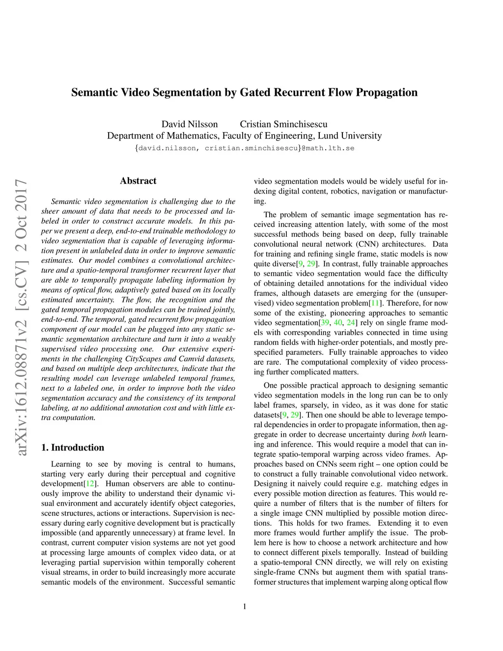 Semantic video segmentation is challenging due to the sheer amount of data that needs to be processed and labeled in order to construct accurate models. In this paper we present a deep, end-to-end trainable methodology to video segmentation that is capable of leveraging information present in unlabeled data in order to improve semantic estimates. Our model combines a convolutional architecture and a spatio-temporal transformer recurrent layer that are able to temporally propagate labeling information by means of optical flow, adaptively gated based on its locally estimated uncertainty. The flow, the recognition and the gated temporal propagation modules can be trained jointly, end-to-end. The temporal, gated recurrent flow propagation component of our model can be plugged into any static semantic segmentation architecture and turn it into a weakly supervised video processing one. Our extensive experiments in the challenging CityScapes and Camvid datasets, and based on multiple deep architectures, indicate that the resulting model can leverage unlabeled temporal frames, next to a labeled one, in order to improve both the video segmentation accuracy and the consistency of its temporal labeling, at no additional annotation cost and with little extra computation.
