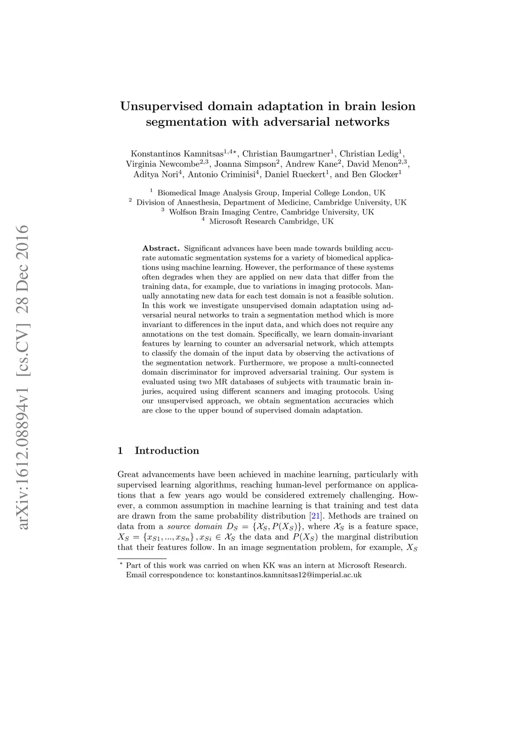 Significant advances have been made towards building accurate automatic segmentation systems for a variety of biomedical applications using machine learning. However, the performance of these systems often degrades when they are applied on new data that differ from the training data, for example, due to variations in imaging protocols. Manually annotating new data for each test domain is not a feasible solution. In this work we investigate unsupervised domain adaptation using adversarial neural networks to train a segmentation method which is more invariant to differences in the input data, and which does not require any annotations on the test domain. Specifically, we learn domain-invariant features by learning to counter an adversarial network, which attempts to classify the domain of the input data by observing the activations of the segmentation network. Furthermore, we propose a multi-connected domain discriminator for improved adversarial training. Our system is evaluated using two MR databases of subjects with traumatic brain injuries, acquired using different scanners and imaging protocols. Using our unsupervised approach, we obtain segmentation accuracies which are close to the upper bound of supervised domain adaptation.