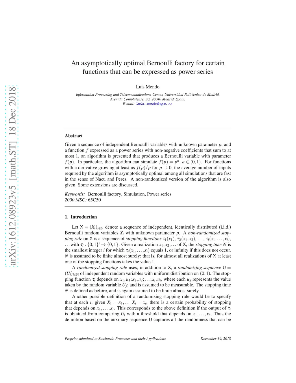 Given a sequence of independent Bernoulli variables with unknown parameter , and a function expressed as a power series with non-negative coefficients that sum to at most , an algorithm is presented that produces a Bernoulli variable with parameter . In particular, the algorithm can simulate , . For functions with a derivative growing at least as for , the average number of inputs required by the algorithm is asymptotically optimal among all simulations that are fast in the sense of Nacu and Peres. A non-randomized version of the algorithm is also given. Some extensions are discussed.