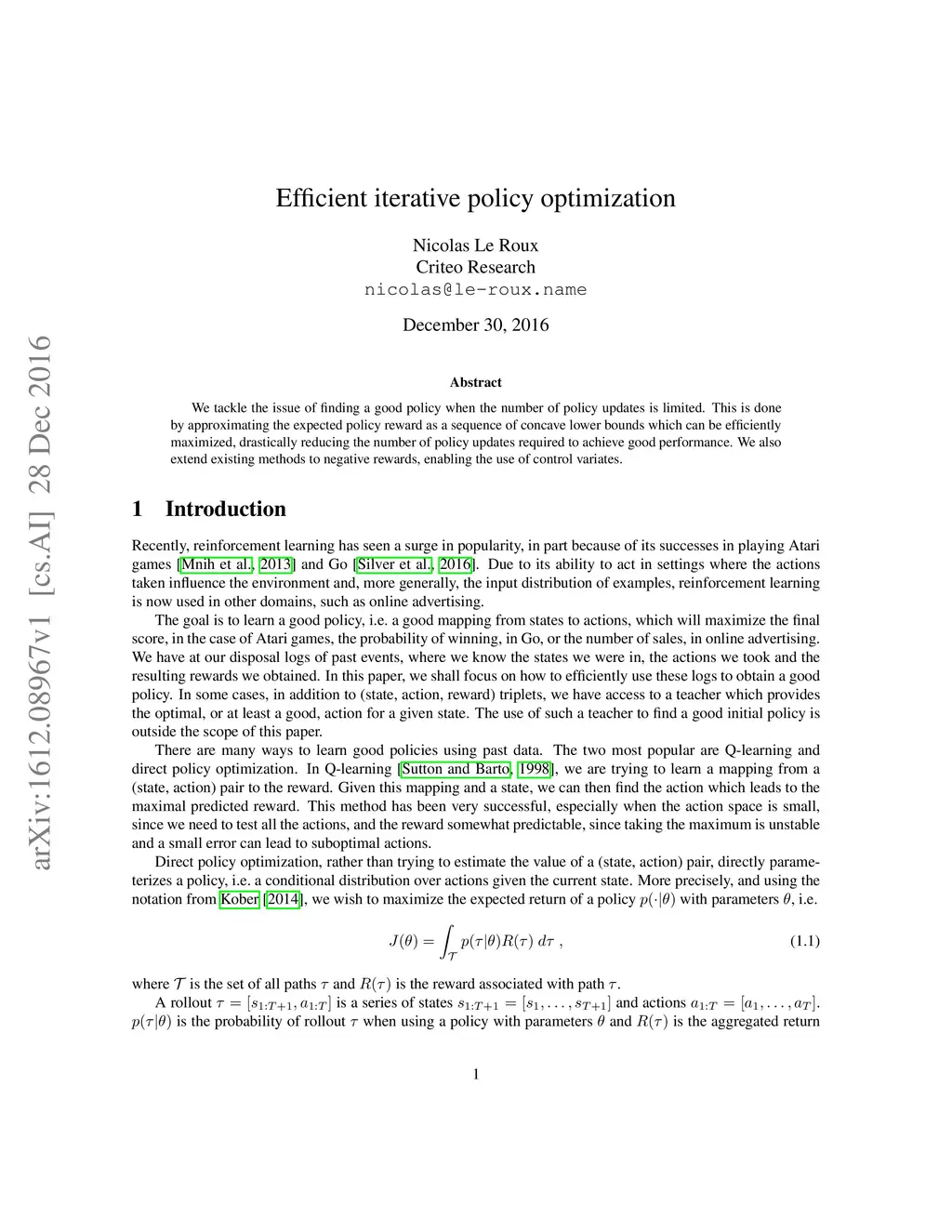 We tackle the issue of finding a good policy when the number of policy updates is limited. This is done by approximating the expected policy reward as a sequence of concave lower bounds which can be efficiently maximized, drastically reducing the number of policy updates required to achieve good performance. We also extend existing methods to negative rewards, enabling the use of control variates.