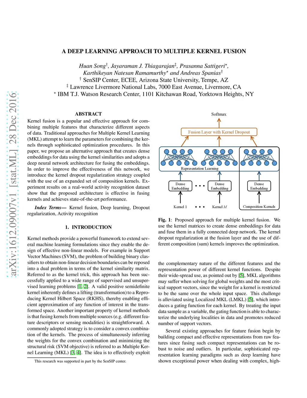 Kernel fusion is a popular and effective approach for combining multiple features that characterize different aspects of data. Traditional approaches for Multiple Kernel Learning (MKL) attempt to learn the parameters for combining the kernels through sophisticated optimization procedures. In this paper, we propose an alternative approach that creates dense embeddings for data using the kernel similarities and adopts a deep neural network architecture for fusing the embeddings. In order to improve the effectiveness of this network, we introduce the kernel dropout regularization strategy coupled with the use of an expanded set of composition kernels. Experiment results on a real-world activity recognition dataset show that the proposed architecture is effective in fusing kernels and achieves state-of-the-art performance.