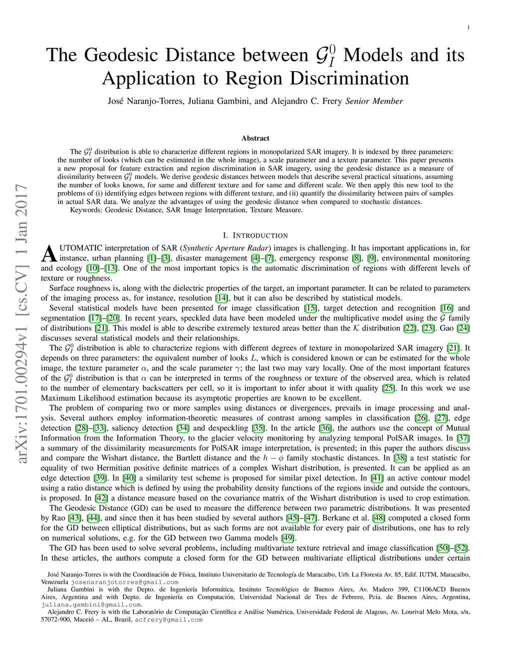 The distribution is able to characterize different regions in monopolarized SAR imagery. It is indexed by three parameters: the number of looks (which can be estimated in the whole image), a scale parameter and a texture parameter. This paper presents a new proposal for feature extraction and region discrimination in SAR imagery, using the geodesic distance as a measure of dissimilarity between models. We derive geodesic distances between models that describe several practical situations, assuming the number of looks known, for same and different texture and for same and different scale. We then apply this new tool to the problems of (i)~identifying edges between regions with different texture, and (ii)~quantify the dissimilarity between pairs of samples in actual SAR data. We analyze the advantages of using the geodesic distance when compared to stochastic distances.