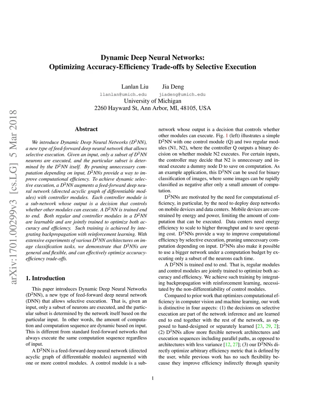 We introduce Dynamic Deep Neural Networks (D2NN), a new type of feed-forward deep neural network that allows selective execution. Given an input, only a subset of D2NN neurons are executed, and the particular subset is determined by the D2NN itself. By pruning unnecessary computation depending on input, D2NNs provide a way to improve computational efficiency. To achieve dynamic selective execution, a D2NN augments a feed-forward deep neural network (directed acyclic graph of differentiable modules) with controller modules. Each controller module is a sub-network whose output is a decision that controls whether other modules can execute. A D2NN is trained end to end. Both regular and controller modules in a D2NN are learnable and are jointly trained to optimize both accuracy and efficiency. Such training is achieved by integrating backpropagation with reinforcement learning. With extensive experiments of various D2NN architectures on image classification tasks, we demonstrate that D2NNs are general and flexible, and can effectively optimize accuracy-efficiency trade-offs.