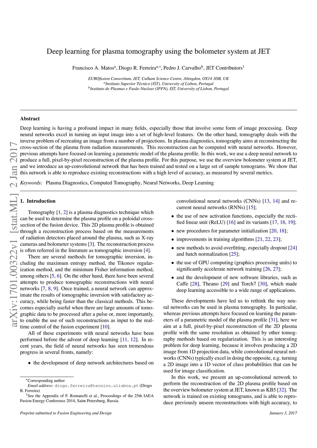 Deep learning is having a profound impact in many fields, especially those that involve some form of image processing. Deep neural networks excel in turning an input image into a set of high-level features. On the other hand, tomography deals with the inverse problem of recreating an image from a number of projections. In plasma diagnostics, tomography aims at reconstructing the cross-section of the plasma from radiation measurements. This reconstruction can be computed with neural networks. However, previous attempts have focused on learning a parametric model of the plasma profile. In this work, we use a deep neural network to produce a full, pixel-by-pixel reconstruction of the plasma profile. For this purpose, we use the overview bolometer system at JET, and we introduce an up-convolutional network that has been trained and tested on a large set of sample tomograms. We show that this network is able to reproduce existing reconstructions with a high level of accuracy, as measured by several metrics.