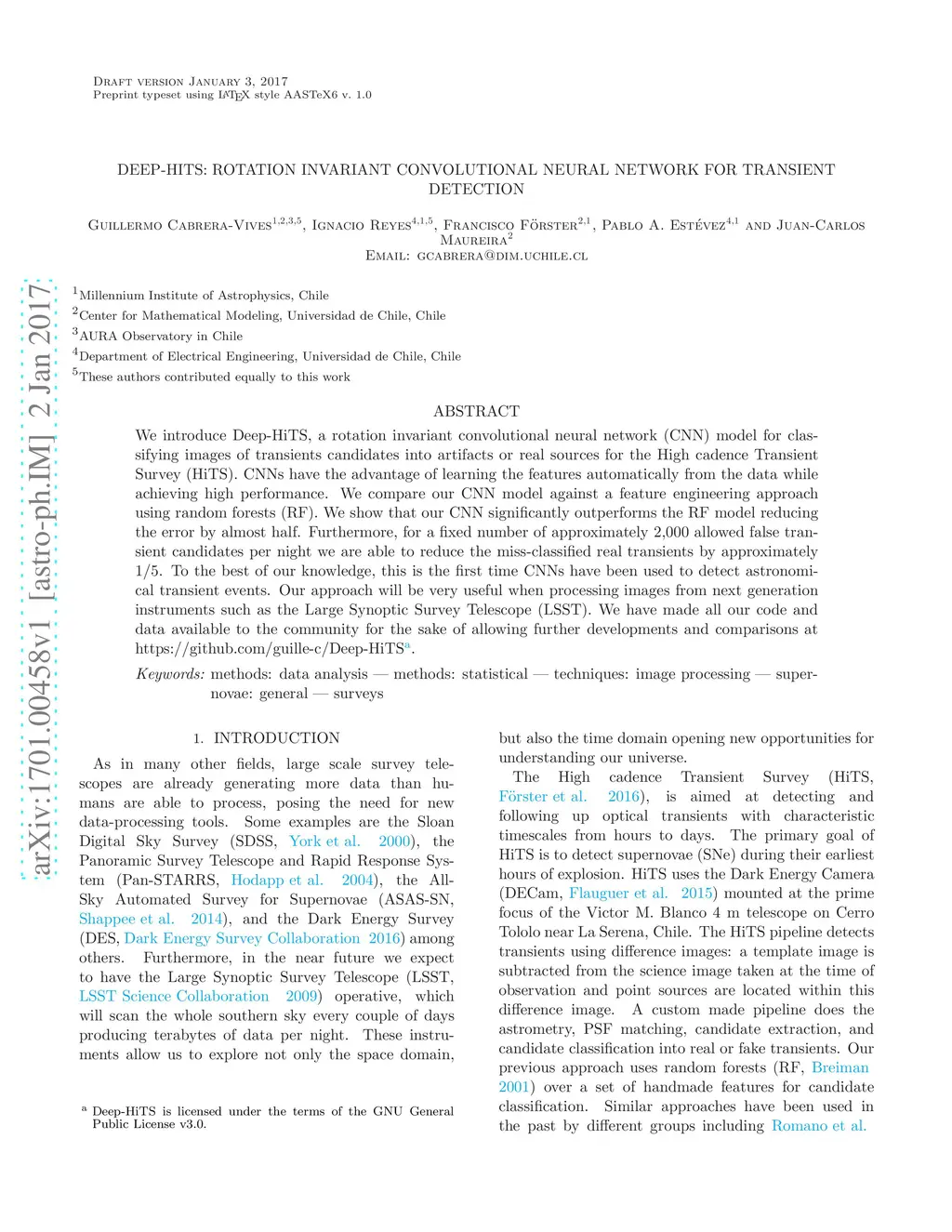 We introduce Deep-HiTS, a rotation invariant convolutional neural network (CNN) model for classifying images of transients candidates into artifacts or real sources for the High cadence Transient Survey (HiTS). CNNs have the advantage of learning the features automatically from the data while achieving high performance. We compare our CNN model against a feature engineering approach using random forests (RF). We show that our CNN significantly outperforms the RF model reducing the error by almost half. Furthermore, for a fixed number of approximately 2,000 allowed false transient candidates per night we are able to reduce the miss-classified real transients by approximately 1/5. To the best of our knowledge, this is the first time CNNs have been used to detect astronomical transient events. Our approach will be very useful when processing images from next generation instruments such as the Large Synoptic Survey Telescope (LSST). We have made all our code and data available to the community for the sake of allowing further developments and comparisons at https://github.com/guille-c/Deep-HiTS.