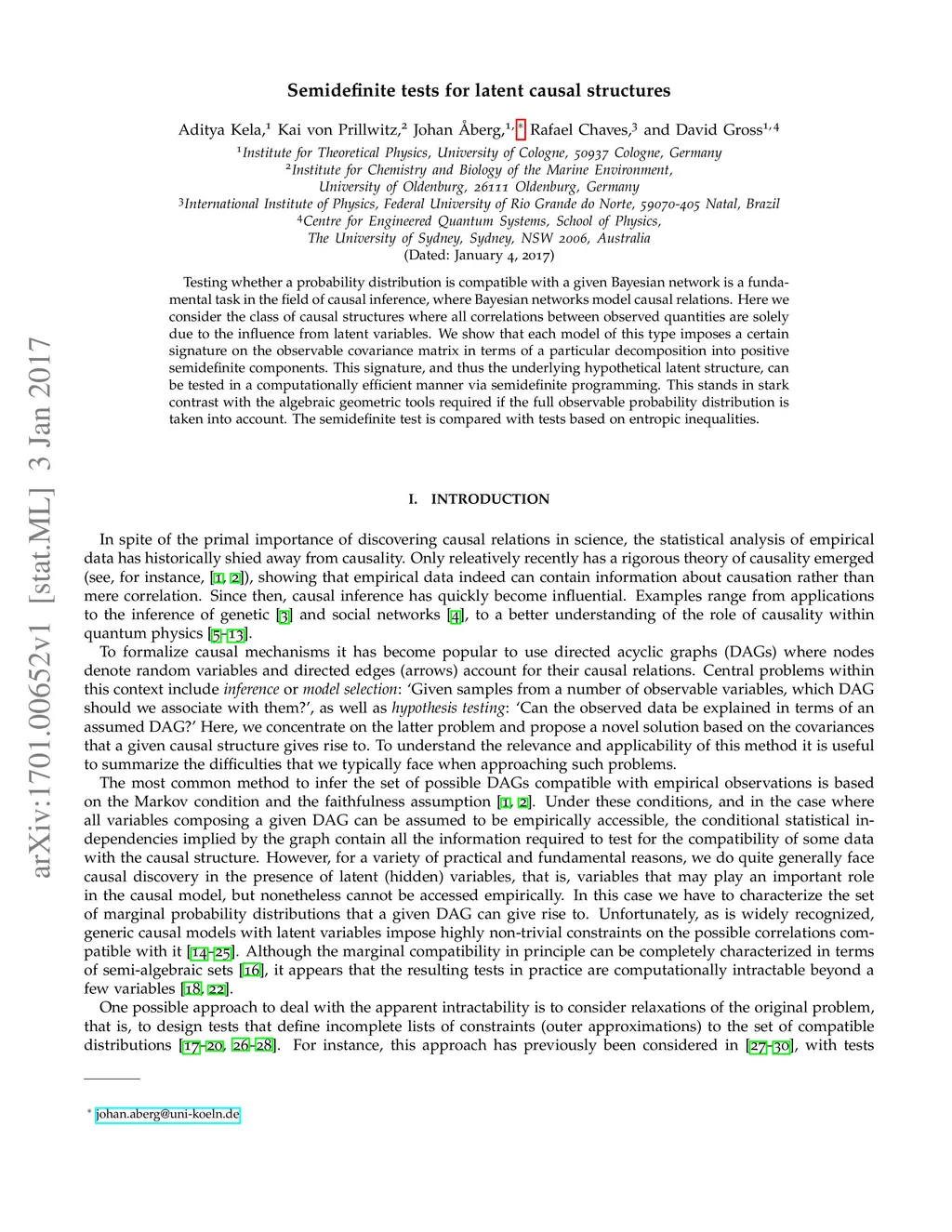 Testing whether a probability distribution is compatible with a given Bayesian network is a fundamental task in the field of causal inference, where Bayesian networks model causal relations. Here we consider the class of causal structures where all correlations between observed quantities are solely due to the influence from latent variables. We show that each model of this type imposes a certain signature on the observable covariance matrix in terms of a particular decomposition into positive semidefinite components. This signature, and thus the underlying hypothetical latent structure, can be tested in a computationally efficient manner via semidefinite programming. This stands in stark contrast with the algebraic geometric tools required if the full observable probability distribution is taken into account. The semidefinite test is compared with tests based on entropic inequalities.