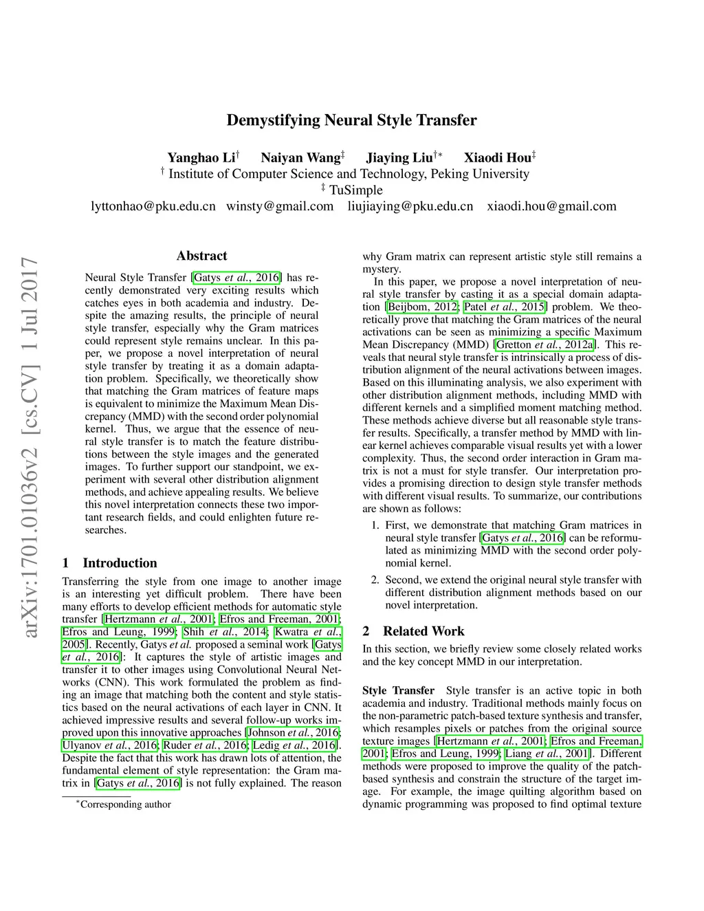 Neural Style Transfer has recently demonstrated very exciting results which catches eyes in both academia and industry. Despite the amazing results, the principle of neural style transfer, especially why the Gram matrices could represent style remains unclear. In this paper, we propose a novel interpretation of neural style transfer by treating it as a domain adaptation problem. Specifically, we theoretically show that matching the Gram matrices of feature maps is equivalent to minimize the Maximum Mean Discrepancy (MMD) with the second order polynomial kernel. Thus, we argue that the essence of neural style transfer is to match the feature distributions between the style images and the generated images. To further support our standpoint, we experiment with several other distribution alignment methods, and achieve appealing results. We believe this novel interpretation connects these two important research fields, and could enlighten future researches.