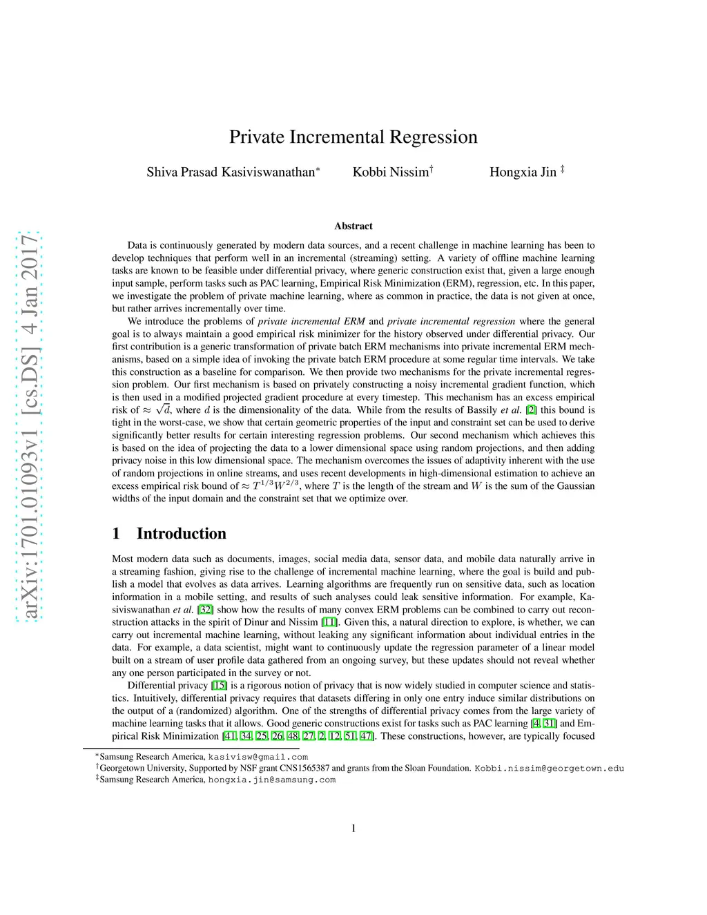 Data is continuously generated by modern data sources, and a recent challenge in machine learning has been to develop techniques that perform well in an incremental (streaming) setting. In this paper, we investigate the problem of private machine learning, where as common in practice, the data is not given at once, but rather arrives incrementally over time. We introduce the problems of private incremental ERM and private incremental regression where the general goal is to always maintain a good empirical risk minimizer for the history observed under differential privacy. Our first contribution is a generic transformation of private batch ERM mechanisms into private incremental ERM mechanisms, based on a simple idea of invoking the private batch ERM procedure at some regular time intervals. We take this construction as a baseline for comparison. We then provide two mechanisms for the private incremental regression problem. Our first mechanism is based on privately constructing a noisy incremental gradient function, which is then used in a modified projected gradient procedure at every timestep. This mechanism has an excess empirical risk of , where is the dimensionality of the data. While from the results of [Bassily et al. 2014] this bound is tight in the worst-case, we show that certain geometric properties of the input and constraint set can be used to derive significantly better results for certain interesting regression problems.