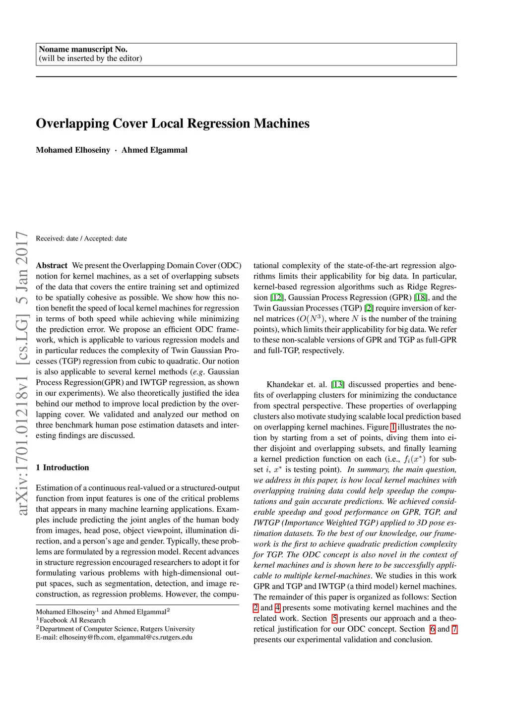 We present the Overlapping Domain Cover (ODC) notion for kernel machines, as a set of overlapping subsets of the data that covers the entire training set and optimized to be spatially cohesive as possible. We show how this notion benefit the speed of local kernel machines for regression in terms of both speed while achieving while minimizing the prediction error. We propose an efficient ODC framework, which is applicable to various regression models and in particular reduces the complexity of Twin Gaussian Processes (TGP) regression from cubic to quadratic. Our notion is also applicable to several kernel methods (e.g., Gaussian Process Regression(GPR) and IWTGP regression, as shown in our experiments). We also theoretically justified the idea behind our method to improve local prediction by the overlapping cover. We validated and analyzed our method on three benchmark human pose estimation datasets and interesting findings are discussed.