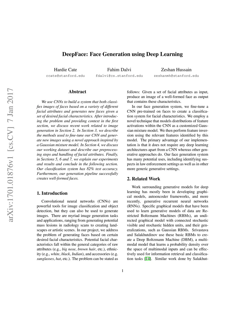 We use CNNs to build a system that both classifies images of faces based on a variety of different facial attributes and generates new faces given a set of desired facial characteristics. After introducing the problem and providing context in the first section, we discuss recent work related to image generation in Section 2. In Section 3, we describe the methods used to fine-tune our CNN and generate new images using a novel approach inspired by a Gaussian mixture model. In Section 4, we discuss our working dataset and describe our preprocessing steps and handling of facial attributes. Finally, in Sections 5, 6 and 7, we explain our experiments and results and conclude in the following section. Our classification system has 82\% test accuracy. Furthermore, our generation pipeline successfully creates well-formed faces.