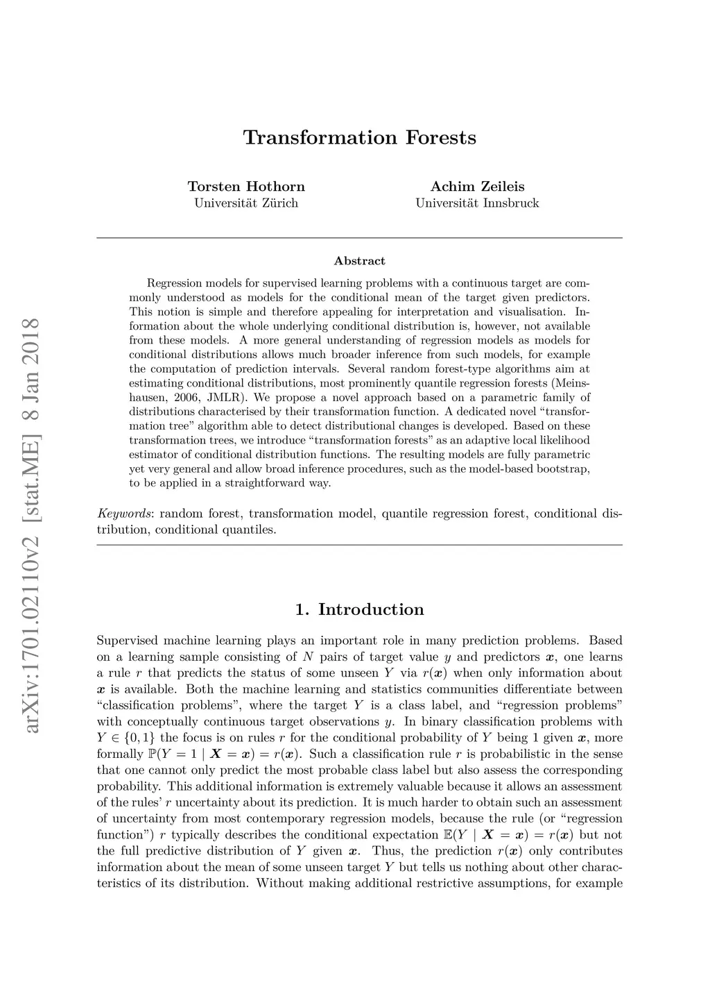Regression models for supervised learning problems with a continuous target are commonly understood as models for the conditional mean of the target given predictors. This notion is simple and therefore appealing for interpretation and visualisation. Information about the whole underlying conditional distribution is, however, not available from these models. A more general understanding of regression models as models for conditional distributions allows much broader inference from such models, for example the computation of prediction intervals. Several random forest-type algorithms aim at estimating conditional distributions, most prominently quantile regression forests (Meinshausen, 2006, JMLR). We propose a novel approach based on a parametric family of distributions characterised by their transformation function. A dedicated novel "transformation tree" algorithm able to detect distributional changes is developed. Based on these transformation trees, we introduce "transformation forests" as an adaptive local likelihood estimator of conditional distribution functions. The resulting models are fully parametric yet very general and allow broad inference procedures, such as the model-based bootstrap, to be applied in a straightforward way.