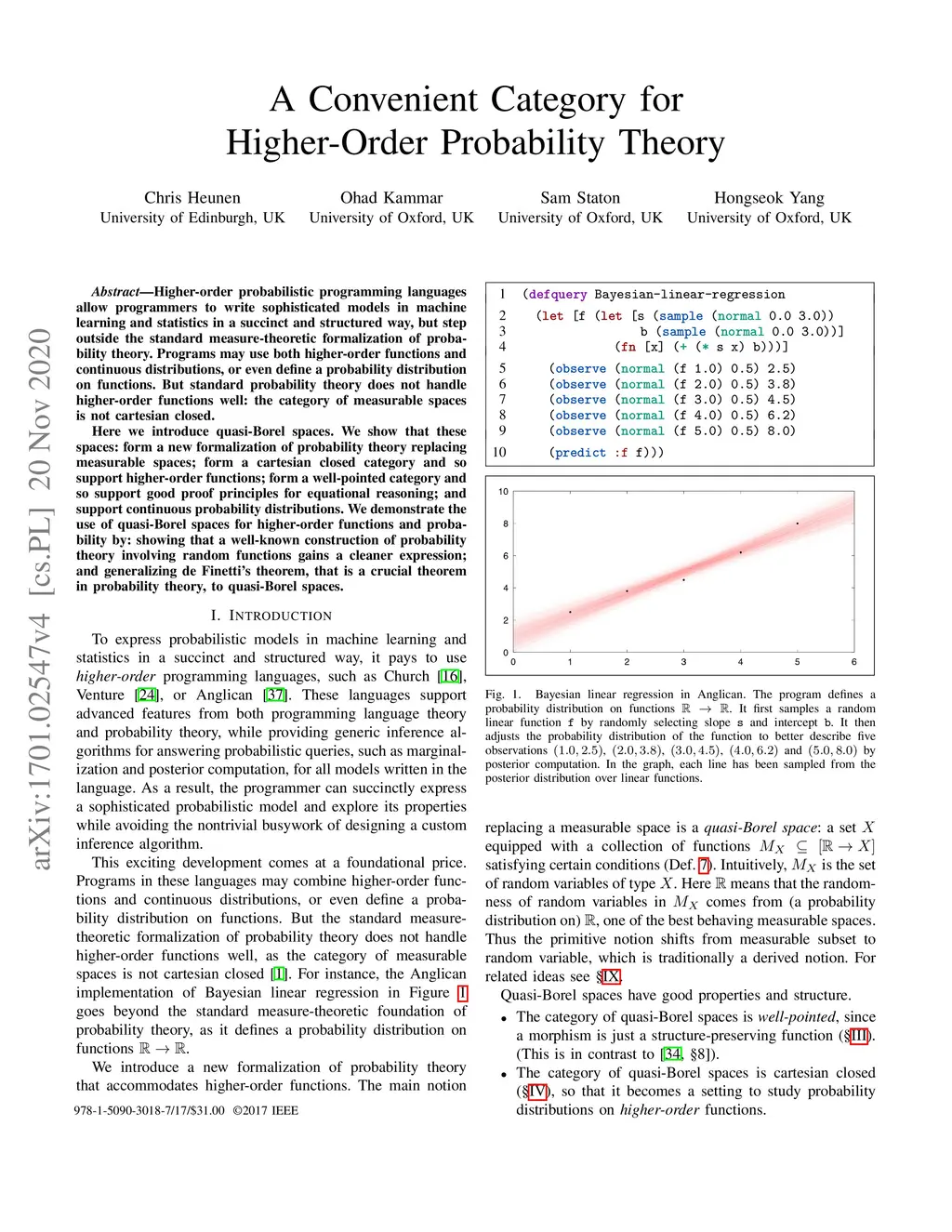 Higher-order probabilistic programming languages allow programmers to write sophisticated models in machine learning and statistics in a succinct and structured way, but step outside the standard measure-theoretic formalization of probability theory. Programs may use both higher-order functions and continuous distributions, or even define a probability distribution on functions. But standard probability theory does not handle higher-order functions well: the category of measurable spaces is not cartesian closed. Here we introduce quasi-Borel spaces. We show that these spaces: form a new formalization of probability theory replacing measurable spaces; form a cartesian closed category and so support higher-order functions; form a well-pointed category and so support good proof principles for equational reasoning; and support continuous probability distributions. We demonstrate the use of quasi-Borel spaces for higher-order functions and probability by: showing that a well-known construction of probability theory involving random functions gains a cleaner expression; and generalizing de Finetti's theorem, that is a crucial theorem in probability theory, to quasi-Borel spaces.