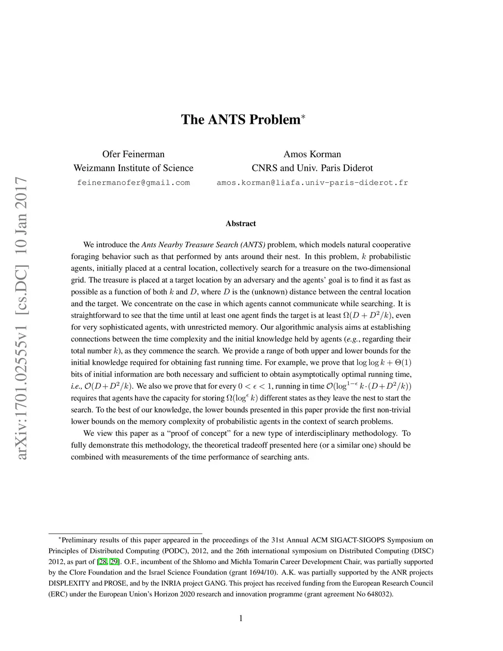 We introduce the Ants Nearby Treasure Search (ANTS) problem, which models natural cooperative foraging behavior such as that performed by ants around their nest. In this problem, k probabilistic agents, initially placed at a central location, collectively search for a treasure on the two-dimensional grid. The treasure is placed at a target location by an adversary and the agents' goal is to find it as fast as possible as a function of both k and D, where D is the (unknown) distance between the central location and the target. We concentrate on the case in which agents cannot communicate while searching. It is straightforward to see that the time until at least one agent finds the target is at least (D + D 2 /k), even for very sophisticated agents, with unrestricted memory. Our algorithmic analysis aims at establishing connections between the time complexity and the initial knowledge held by agents (e.g., regarding their total number k), as they commence the search. We provide a range of both upper and lower bounds for the initial knowledge required for obtaining fast running time. For example, we prove that log log k + (1) bits of initial information are both necessary and sufficient to obtain asymptotically optimal running time, i.e., O(D +D 2 /k). We also we prove that for every 0 \textless{} \textless{} 1, running in time O(log 1-- k (D +D 2 /k)) requires that agents have the capacity for storing (log k) different states as they leave the nest to start the search. To the best of our knowledge, the lower bounds presented in this paper provide the first non-trivial lower bounds on the memory complexity of probabilistic agents in the context of search problems. We view this paper as a "proof of concept" for a new type of interdisciplinary methodology. To fully demonstrate this methodology, the theoretical tradeoff presented here (or a similar one) should be combined with measurements of the time performance of searching ants.