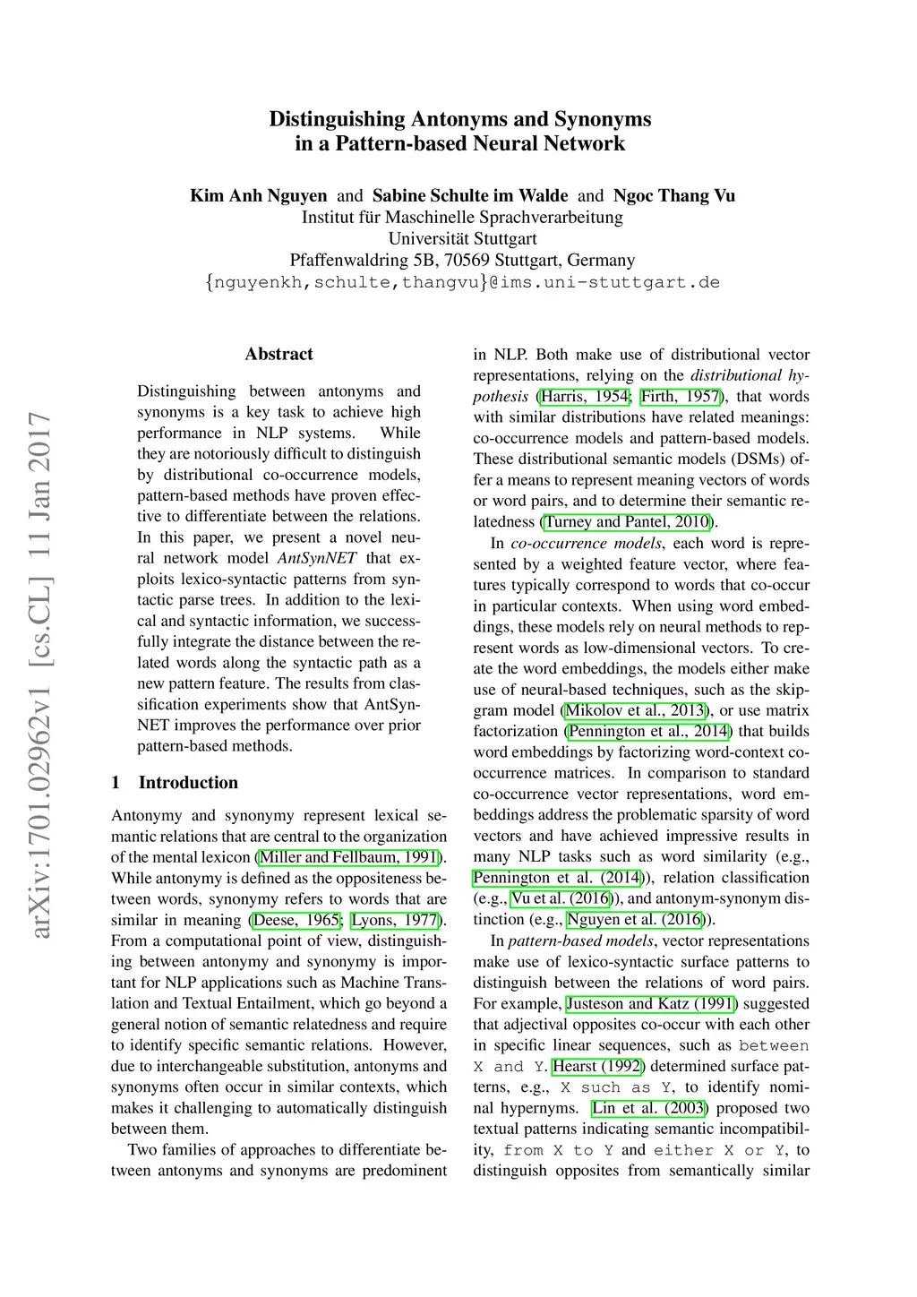 Distinguishing Antonyms and Synonyms in a Pattern-based Neural Network