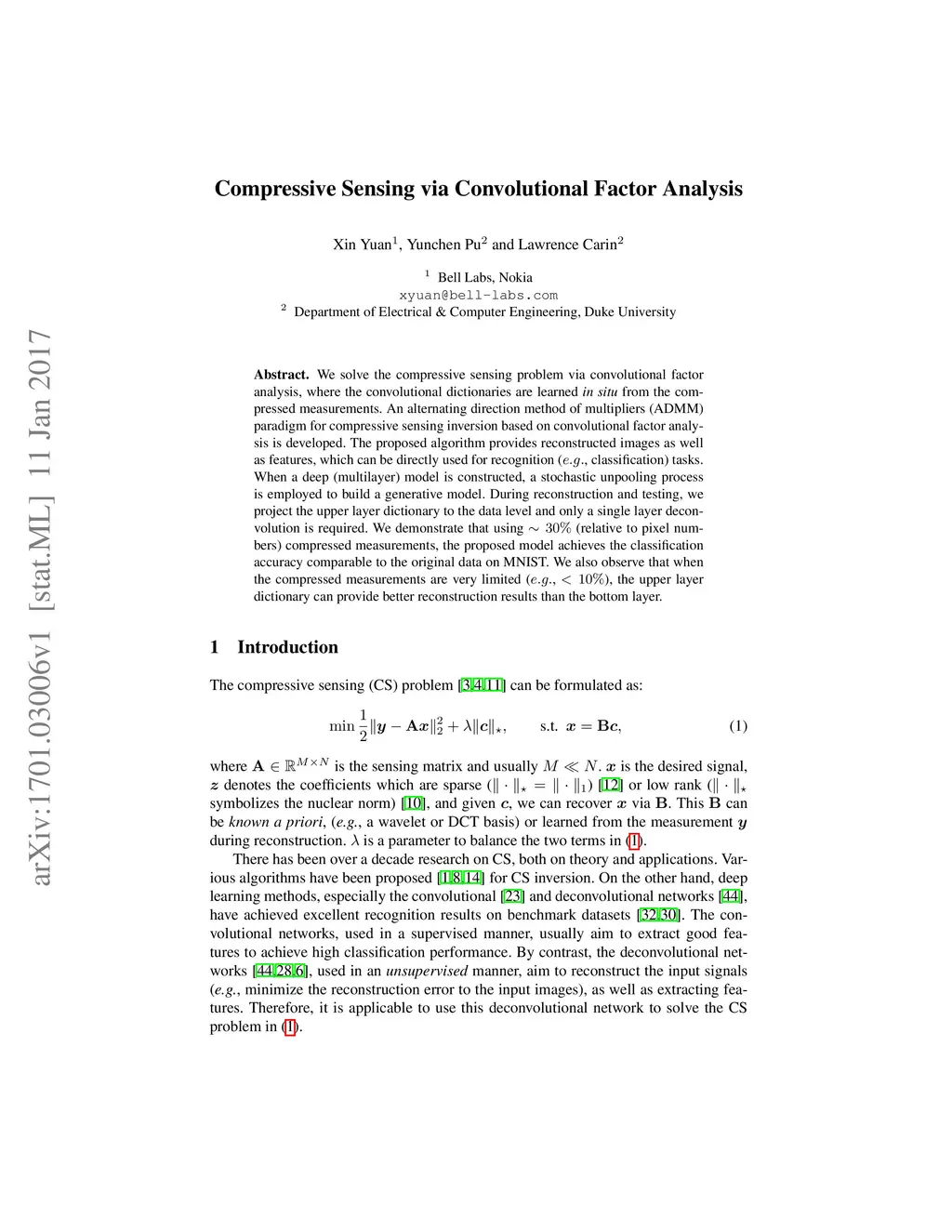 We solve the compressive sensing problem via convolutional factor analysis, where the convolutional dictionaries are learned {\em in situ} from the compressed measurements. An alternating direction method of multipliers (ADMM) paradigm for compressive sensing inversion based on convolutional factor analysis is developed. The proposed algorithm provides reconstructed images as well as features, which can be directly used for recognition (, classification) tasks. When a deep (multilayer) model is constructed, a stochastic unpooling process is employed to build a generative model. During reconstruction and testing, we project the upper layer dictionary to the data level and only a single layer deconvolution is required. We demonstrate that using (relative to pixel numbers) compressed measurements, the proposed model achieves the classification accuracy comparable to the original data on MNIST. We also observe that when the compressed measurements are very limited (, ), the upper layer dictionary can provide better reconstruction results than the bottom layer.