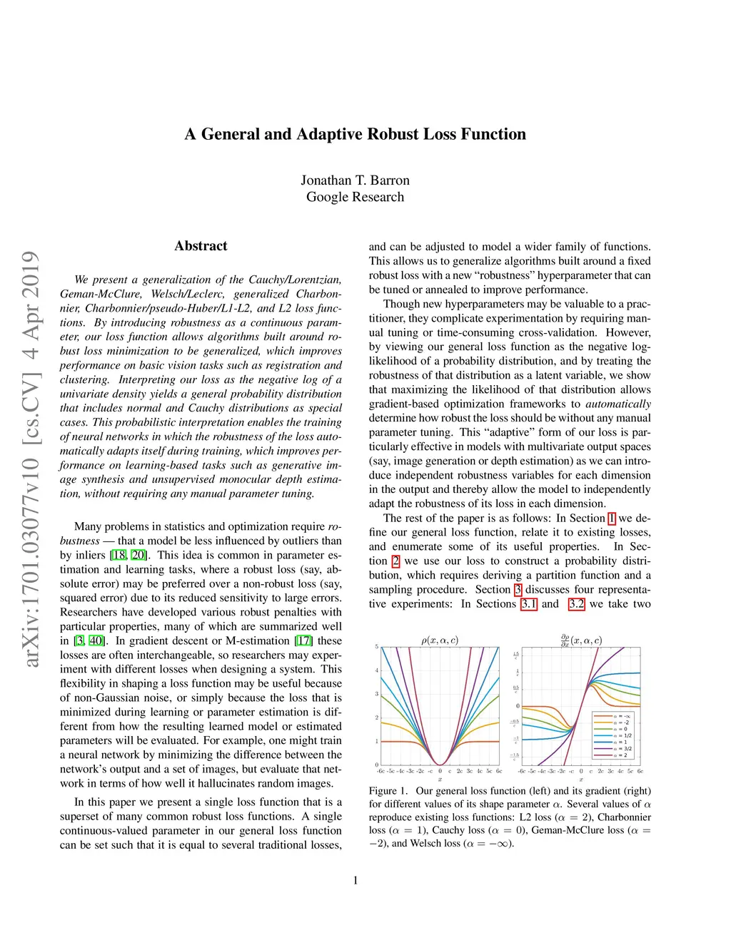 We present a generalization of the Cauchy/Lorentzian, Geman-McClure, Welsch/Leclerc, generalized Charbonnier, Charbonnier/pseudo-Huber/L1-L2, and L2 loss functions. By introducing robustness as a continuous parameter, our loss function allows algorithms built around robust loss minimization to be generalized, which improves performance on basic vision tasks such as registration and clustering. Interpreting our loss as the negative log of a univariate density yields a general probability distribution that includes normal and Cauchy distributions as special cases. This probabilistic interpretation enables the training of neural networks in which the robustness of the loss automatically adapts itself during training, which improves performance on learning-based tasks such as generative image synthesis and unsupervised monocular depth estimation, without requiring any manual parameter tuning.
