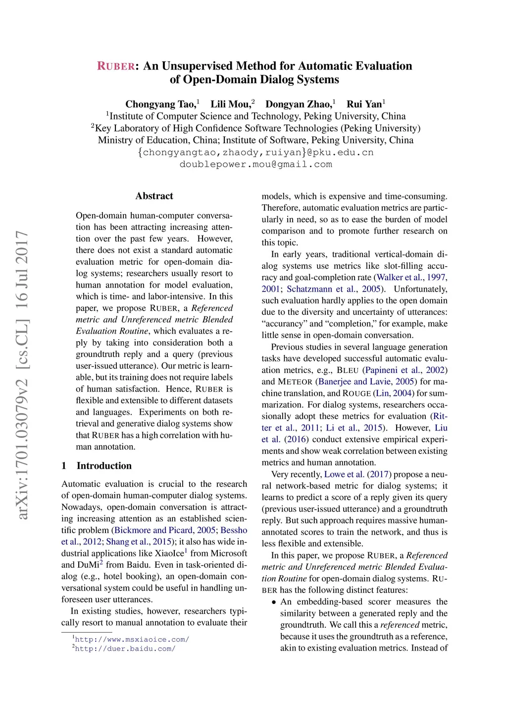 RUBER: An Unsupervised Method for Automatic Evaluation of Open-Domain