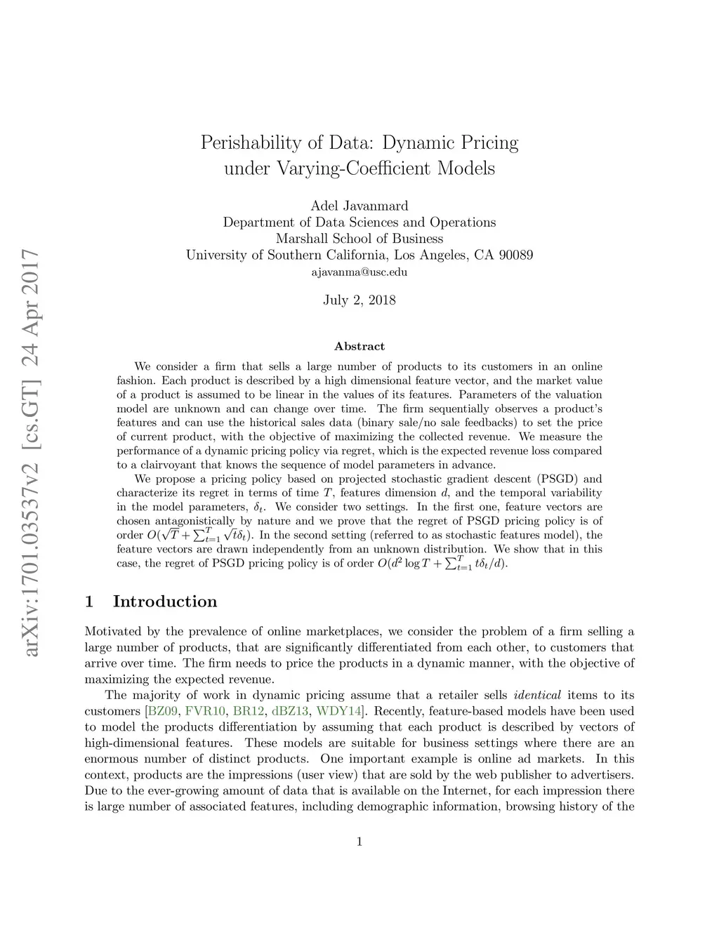 We consider a firm that sells a large number of products to its customers in an online fashion. Each product is described by a high dimensional feature vector, and the market value of a product is assumed to be linear in the values of its features. Parameters of the valuation model are unknown and can change over time. The firm sequentially observes a product's features and can use the historical sales data (binary sale/no sale feedbacks) to set the price of current product, with the objective of maximizing the collected revenue. We measure the performance of a dynamic pricing policy via regret, which is the expected revenue loss compared to a clairvoyant that knows the sequence of model parameters in advance. We propose a pricing policy based on projected stochastic gradient descent (PSGD) and characterize its regret in terms of time , features dimension , and the temporal variability in the model parameters, . We consider two settings. In the first one, feature vectors are chosen antagonistically by nature and we prove that the regret of PSGD pricing policy is of order . In the second setting (referred to as stochastic features model), the feature vectors are drawn independently from an unknown distribution. We show that in this case, the regret of PSGD pricing policy is of order .