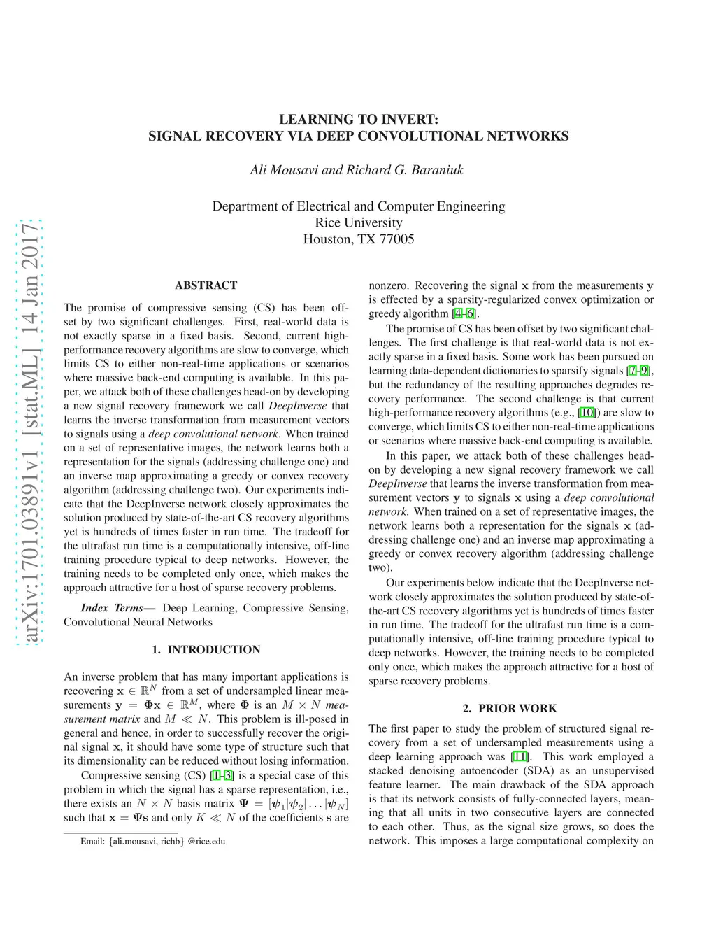 The promise of compressive sensing (CS) has been offset by two significant challenges. First, real-world data is not exactly sparse in a fixed basis. Second, current high-performance recovery algorithms are slow to converge, which limits CS to either non-real-time applications or scenarios where massive back-end computing is available. In this paper, we attack both of these challenges head-on by developing a new signal recovery framework we call {\em DeepInverse} that learns the inverse transformation from measurement vectors to signals using a {\em deep convolutional network}. When trained on a set of representative images, the network learns both a representation for the signals (addressing challenge one) and an inverse map approximating a greedy or convex recovery algorithm (addressing challenge two). Our experiments indicate that the DeepInverse network closely approximates the solution produced by state-of-the-art CS recovery algorithms yet is hundreds of times faster in run time. The tradeoff for the ultrafast run time is a computationally intensive, off-line training procedure typical to deep networks. However, the training needs to be completed only once, which makes the approach attractive for a host of sparse recovery problems.