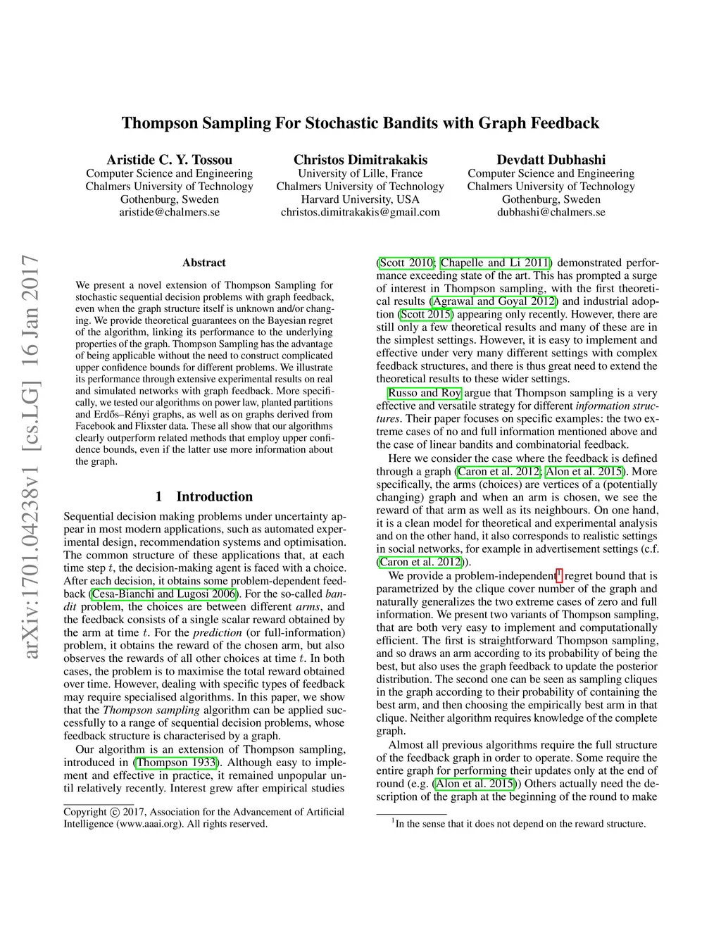 We present a novel extension of Thompson Sampling for stochastic sequential decision problems with graph feedback, even when the graph structure itself is unknown and/or changing. We provide theoretical guarantees on the Bayesian regret of the algorithm, linking its performance to the underlying properties of the graph. Thompson Sampling has the advantage of being applicable without the need to construct complicated upper confidence bounds for different problems. We illustrate its performance through extensive experimental results on real and simulated networks with graph feedback. More specifically, we tested our algorithms on power law, planted partitions and Erdo's-Renyi graphs, as well as on graphs derived from Facebook and Flixster data. These all show that our algorithms clearly outperform related methods that employ upper confidence bounds, even if the latter use more information about the graph.