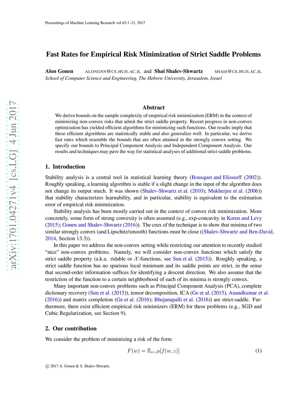 We derive bounds on the sample complexity of empirical risk minimization (ERM) in the context of minimizing non-convex risks that admit the strict saddle property. Recent progress in non-convex optimization has yielded efficient algorithms for minimizing such functions. Our results imply that these efficient algorithms are statistically stable and also generalize well. In particular, we derive fast rates which resemble the bounds that are often attained in the strongly convex setting. We specify our bounds to Principal Component Analysis and Independent Component Analysis. Our results and techniques may pave the way for statistical analyses of additional strict saddle problems.