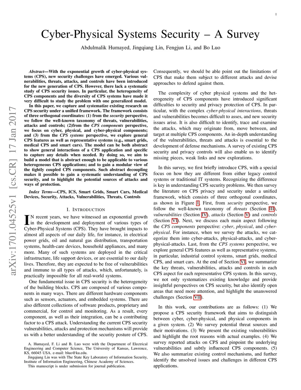 With the exponential growth of cyber-physical systems (CPS), new security challenges have emerged. Various vulnerabilities, threats, attacks, and controls have been introduced for the new generation of CPS. However, there lack a systematic study of CPS security issues. In particular, the heterogeneity of CPS components and the diversity of CPS systems have made it very difficult to study the problem with one generalized model. In this paper, we capture and systematize existing research on CPS security under a unified framework. The framework consists of three orthogonal coordinates: (1) from the \emph{security} perspective, we follow the well-known taxonomy of threats, vulnerabilities, attacks and controls; (2)from the \emph{CPS components} perspective, we focus on cyber, physical, and cyber-physical components; and (3) from the \emph{CPS systems} perspective, we explore general CPS features as well as representative systems (e.g., smart grids, medical CPS and smart cars). The model can be both abstract to show general interactions of a CPS application and specific to capture any details when needed. By doing so, we aim to build a model that is abstract enough to be applicable to various heterogeneous CPS applications; and to gain a modular view of the tightly coupled CPS components. Such abstract decoupling makes it possible to gain a systematic understanding of CPS security, and to highlight the potential sources of attacks and ways of protection.