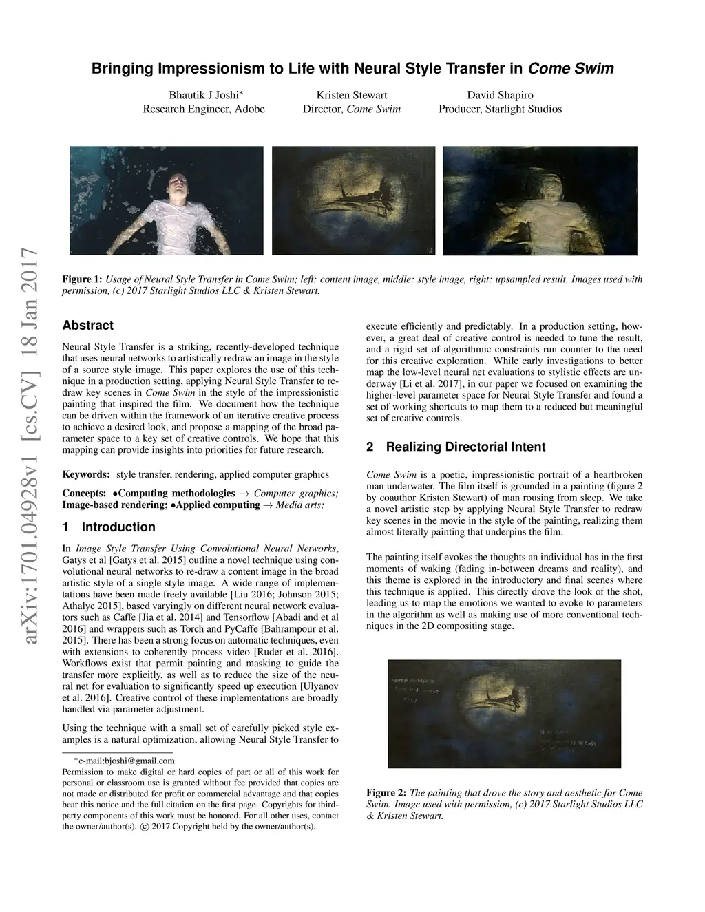 Neural Style Transfer is a striking, recently-developed technique that uses neural networks to artistically redraw an image in the style of a source style image. This paper explores the use of this technique in a production setting, applying Neural Style Transfer to redraw key scenes in 'Come Swim' in the style of the impressionistic painting that inspired the film. We document how the technique can be driven within the framework of an iterative creative process to achieve a desired look, and propose a mapping of the broad parameter space to a key set of creative controls. We hope that this mapping can provide insights into priorities for future research.