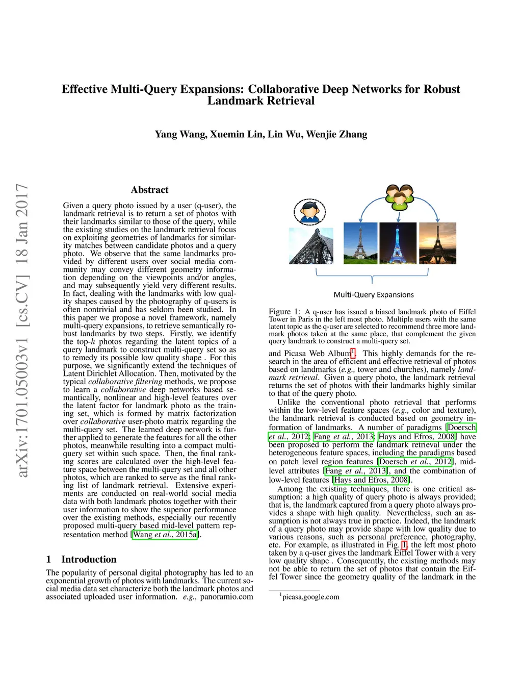 Given a query photo issued by a user (q-user), the landmark retrieval is to return a set of photos with their landmarks similar to those of the query, while the existing studies on the landmark retrieval focus on exploiting geometries of landmarks for similarity matches between candidate photos and a query photo. We observe that the same landmarks provided by different users over social media community may convey different geometry information depending on the viewpoints and/or angles, and may subsequently yield very different results. In fact, dealing with the landmarks with \illshapes caused by the photography of q-users is often nontrivial and has seldom been studied. In this paper we propose a novel framework, namely multi-query expansions, to retrieve semantically robust landmarks by two steps. Firstly, we identify the top- photos regarding the latent topics of a query landmark to construct multi-query set so as to remedy its possible \illshape. For this purpose, we significantly extend the techniques of Latent Dirichlet Allocation. Then, motivated by the typical \emph{collaborative filtering} methods, we propose to learn a \emph{collaborative} deep networks based semantically, nonlinear and high-level features over the latent factor for landmark photo as the training set, which is formed by matrix factorization over \emph{collaborative} user-photo matrix regarding the multi-query set. The learned deep network is further applied to generate the features for all the other photos, meanwhile resulting into a compact multi-query set within such space. Extensive experiments are conducted on real-world social media data with both landmark photos together with their user information to show the superior performance over the existing methods.