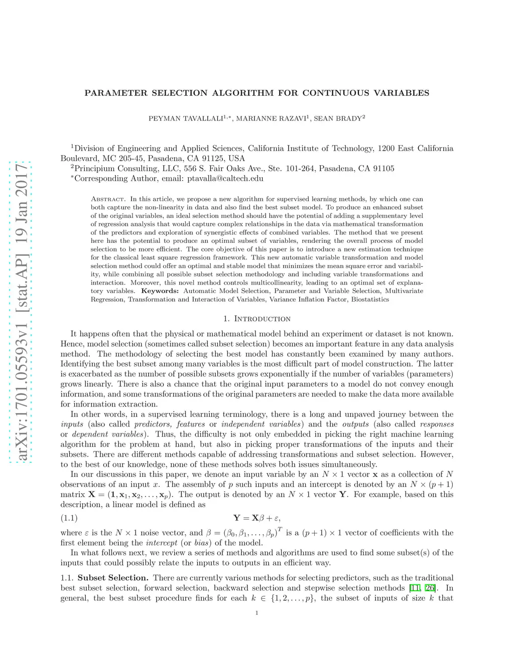 In this article, we propose a new algorithm for supervised learning methods, by which one can both capture the non-linearity in data and also find the best subset model. To produce an enhanced subset of the original variables, an ideal selection method should have the potential of adding a supplementary level of regression analysis that would capture complex relationships in the data via mathematical transformation of the predictors and exploration of synergistic effects of combined variables. The method that we present here has the potential to produce an optimal subset of variables, rendering the overall process of model selection to be more efficient. The core objective of this paper is to introduce a new estimation technique for the classical least square regression framework. This new automatic variable transformation and model selection method could offer an optimal and stable model that minimizes the mean square error and variability, while combining all possible subset selection methodology and including variable transformations and interaction. Moreover, this novel method controls multicollinearity, leading to an optimal set of explanatory variables.