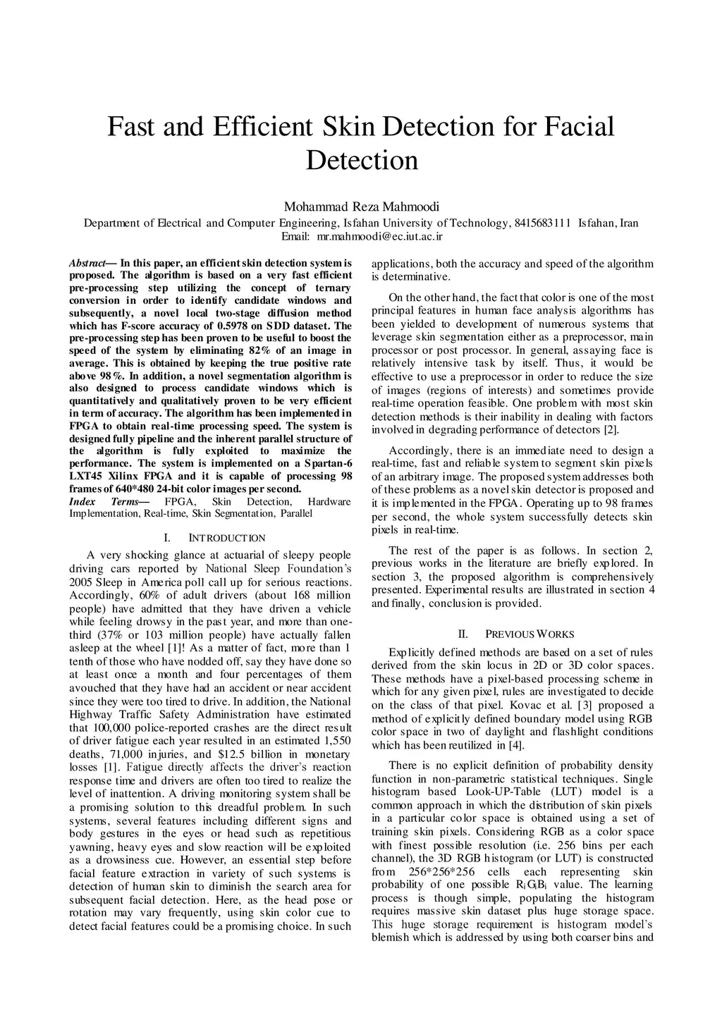 In this paper, an efficient skin detection system is proposed. The algorithm is based on a very fast efficient pre-processing step utilizing the concept of ternary conversion in order to identify candidate windows and subsequently, a novel local two-stage diffusion method which has F-score accuracy of 0.5978 on SDD dataset. The pre-processing step has been proven to be useful to boost the speed of the system by eliminating 82% of an image in average. This is obtained by keeping the true positive rate above 98%. In addition, a novel segmentation algorithm is also designed to process candidate windows which is quantitatively and qualitatively proven to be very efficient in term of accuracy. The algorithm has been implemented in FPGA to obtain real-time processing speed. The system is designed fully pipeline and the inherent parallel structure of the algorithm is fully exploited to maximize the performance. The system is implemented on a Spartan-6 LXT45 Xilinx FPGA and it is capable of processing 98 frames of 640*480 24-bit color images per second.