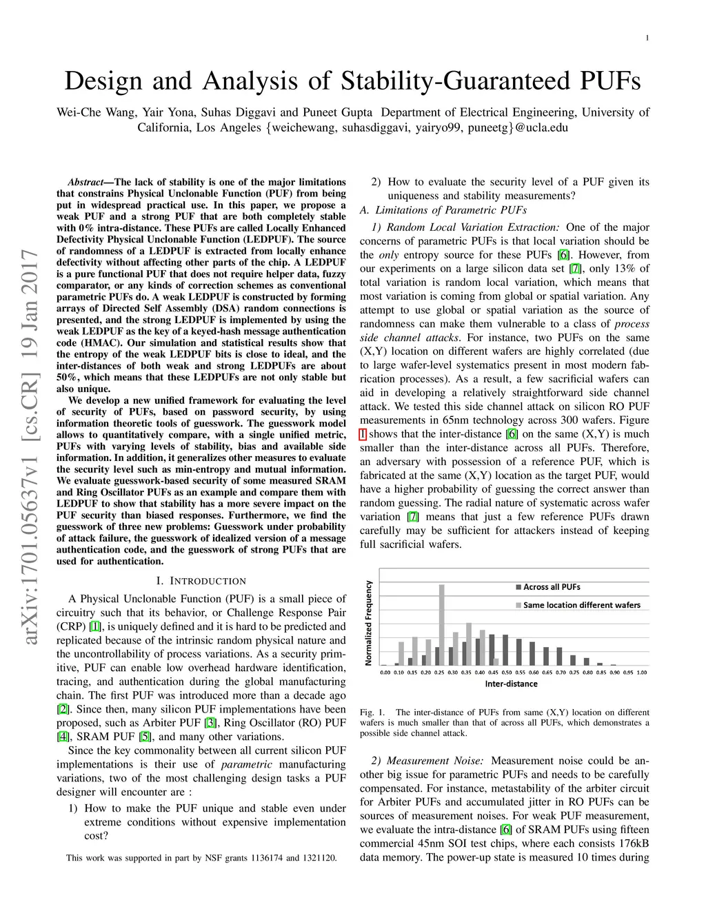 The lack of stability is one of the major limitations that constrains PUF from being put in widespread practical use. In this paper, we propose a weak PUF and a strong PUF that are both completely stable with 0% intra-distance. These PUFs are called Locally Enhanced Defectivity (LED)PUF. The source of randomness of a LEDPUF is extracted from locally enhance defectivity without affecting other parts of the chip. A LEDPUF is a pure functional PUF that does not require any kinds of correction schemes as conventional parametric PUFs do. A weak LEDPUF is constructed by forming arrays of Directed Self Assembly (DSA) random connections is presented, and the strong LEDPUF is implemented by using the weak LEDPUF as the key of a keyed-hash message authentication code (HMAC). Our simulation and statistical results show that the entropy of the weak LEDPUF bits is close to ideal, and the inter-distances of both weak and strong LEDPUFs are about 50%, which means that these LEDPUFs are not only stable but also unique. We develop a new unified framework for evaluating the level of security of PUFs, based on password security, by using information theoretic tools of guesswork. The guesswork model allows to quantitatively compare, with a single unified metric, PUFs with varying levels of stability, bias and available side information. In addition, it generalizes other measures to evaluate the security level such as min-entropy and mutual information. We evaluate guesswork-based security of some measured SRAM and Ring Oscillator PUFs as an example and compare them with LEDPUF to show that stability has a more severe impact on the PUF security than biased responses. Furthermore, we find the guesswork of three new problems: Guesswork under probability of attack failure, the guesswork of idealized version of a message authentication code, and the guesswork of strong PUFs that are used for authentication.