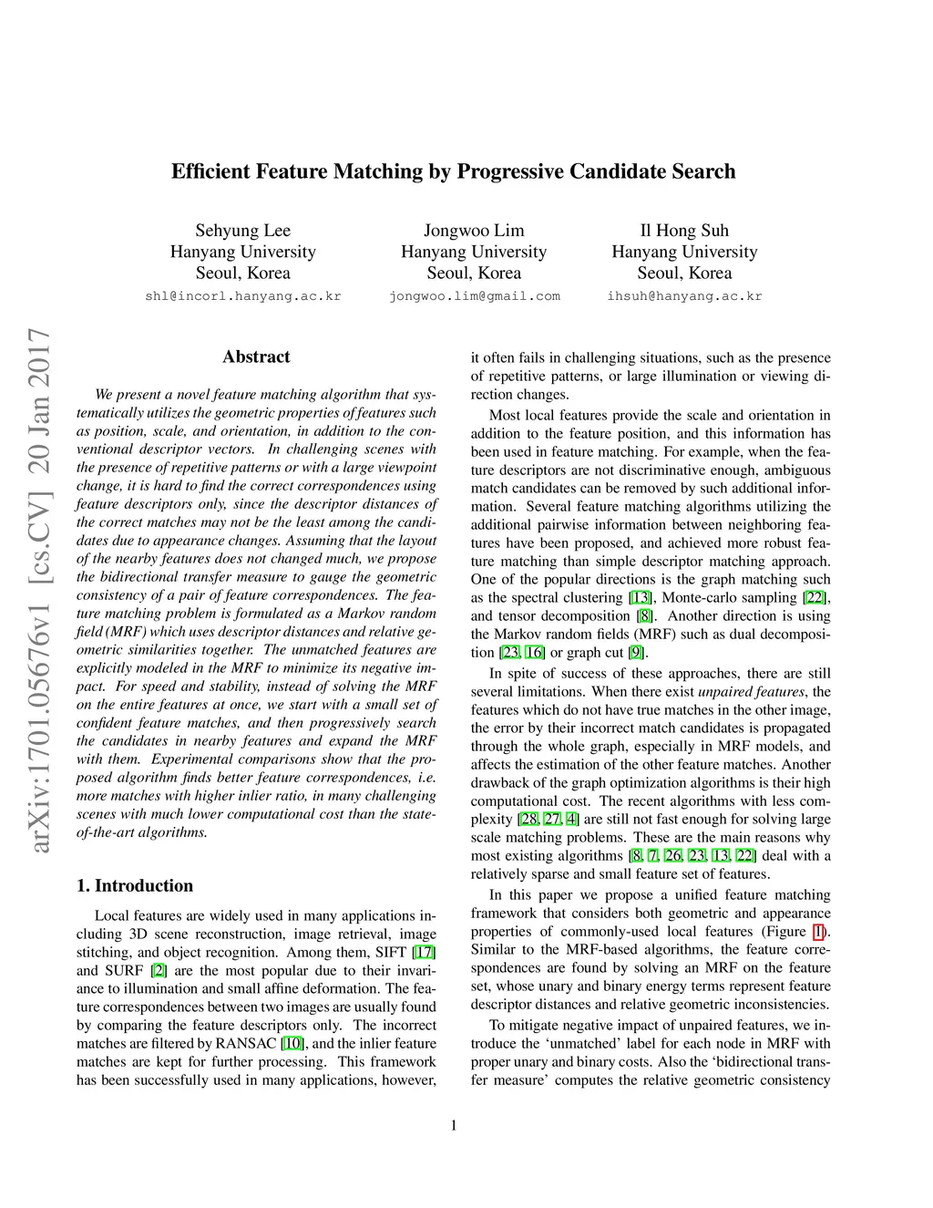 We present a novel feature matching algorithm that systematically utilizes the geometric properties of features such as position, scale, and orientation, in addition to the conventional descriptor vectors. In challenging scenes with the presence of repetitive patterns or with a large viewpoint change, it is hard to find the correct correspondences using feature descriptors only, since the descriptor distances of the correct matches may not be the least among the candidates due to appearance changes. Assuming that the layout of the nearby features does not changed much, we propose the bidirectional transfer measure to gauge the geometric consistency of a pair of feature correspondences. The feature matching problem is formulated as a Markov random field (MRF) which uses descriptor distances and relative geometric similarities together. The unmatched features are explicitly modeled in the MRF to minimize its negative impact. For speed and stability, instead of solving the MRF on the entire features at once, we start with a small set of confident feature matches, and then progressively search the candidates in nearby features and expand the MRF with them. Experimental comparisons show that the proposed algorithm finds better feature correspondences, i.e. more matches with higher inlier ratio, in many challenging scenes with much lower computational cost than the state-of-the-art algorithms.