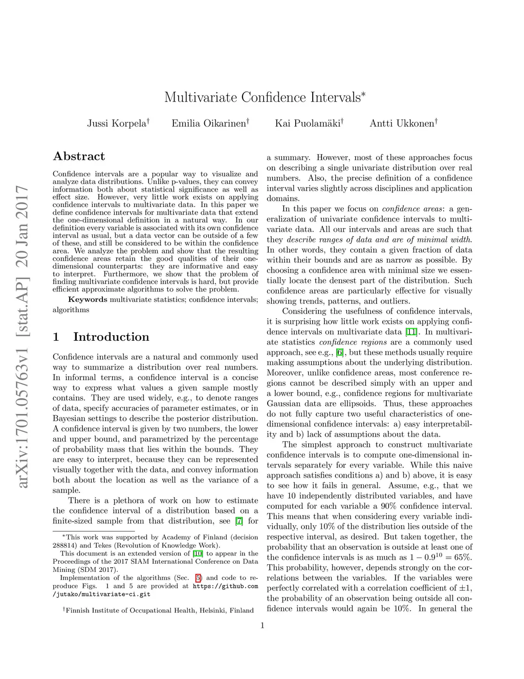 Confidence intervals are a popular way to visualize and analyze data distributions. Unlike p-values, they can convey information both about statistical significance as well as effect size. However, very little work exists on applying confidence intervals to multivariate data. In this paper we define confidence intervals for multivariate data that extend the one-dimensional definition in a natural way. In our definition every variable is associated with its own confidence interval as usual, but a data vector can be outside of a few of these, and still be considered to be within the confidence area. We analyze the problem and show that the resulting confidence areas retain the good qualities of their one-dimensional counterparts: they are informative and easy to interpret. Furthermore, we show that the problem of finding multivariate confidence intervals is hard, but provide efficient approximate algorithms to solve the problem.
