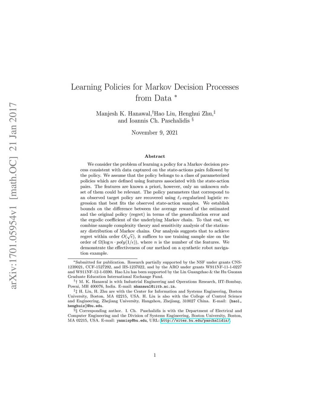 We consider the problem of learning a policy for a Markov decision process consistent with data captured on the state-actions pairs followed by the policy. We assume that the policy belongs to a class of parameterized policies which are defined using features associated with the state-action pairs. The features are known a priori, however, only an unknown subset of them could be relevant. The policy parameters that correspond to an observed target policy are recovered using -regularized logistic regression that best fits the observed state-action samples. We establish bounds on the difference between the average reward of the estimated and the original policy (regret) in terms of the generalization error and the ergodic coefficient of the underlying Markov chain. To that end, we combine sample complexity theory and sensitivity analysis of the stationary distribution of Markov chains. Our analysis suggests that to achieve regret within order , it suffices to use training sample size on the order of , where is the number of the features. We demonstrate the effectiveness of our method on a synthetic robot navigation example.
