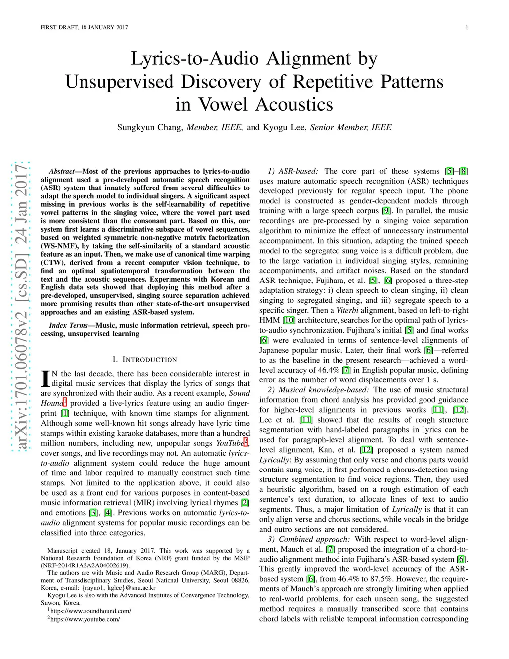 Most of the previous approaches to lyrics-to-audio alignment used a pre-developed automatic speech recognition (ASR) system that innately suffered from several difficulties to adapt the speech model to individual singers. A significant aspect missing in previous works is the self-learnability of repetitive vowel patterns in the singing voice, where the vowel part used is more consistent than the consonant part. Based on this, our system first learns a discriminative subspace of vowel sequences, based on weighted symmetric non-negative matrix factorization (WS-NMF), by taking the self-similarity of a standard acoustic feature as an input. Then, we make use of canonical time warping (CTW), derived from a recent computer vision technique, to find an optimal spatiotemporal transformation between the text and the acoustic sequences. Experiments with Korean and English data sets showed that deploying this method after a pre-developed, unsupervised, singing source separation achieved more promising results than other state-of-the-art unsupervised approaches and an existing ASR-based system.